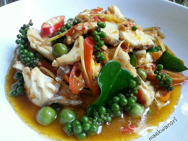 5.ใส่มะเขือพวง /ใบมะกรูด/กระชาย/พริกชี้ฟ้า/พริกไทยอ่อน ลงไปผัดให้เข้ากันไม่ต้องนาน ตักใส่จานเสริฟได้เลย