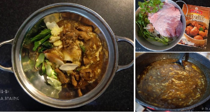 7. เติมน้ำเปล่าลงไปพอประมาณ ใส่ผงพะโล้อีกครั้ง ปรุงรสด้วย ซอสปรุงรส เต้าเจี้ยว ซีอิ๊วดำ น้ำปลา ผงปรุงรส น้ำตาล แล้วต้มต่อไปจนเดือดหรือจนหมูสุกเปื่อยได้ที่