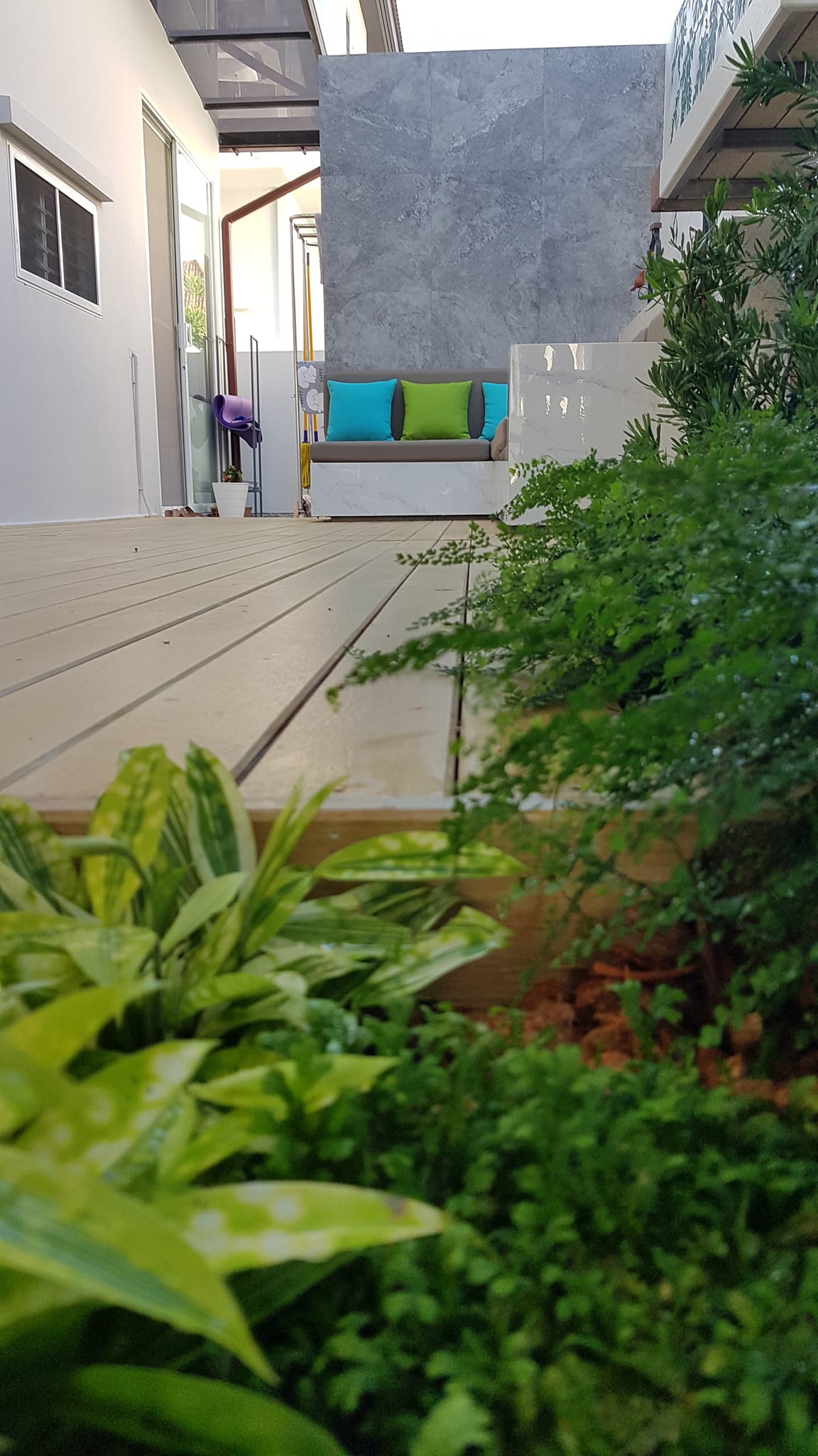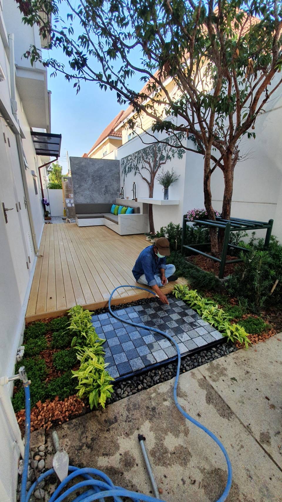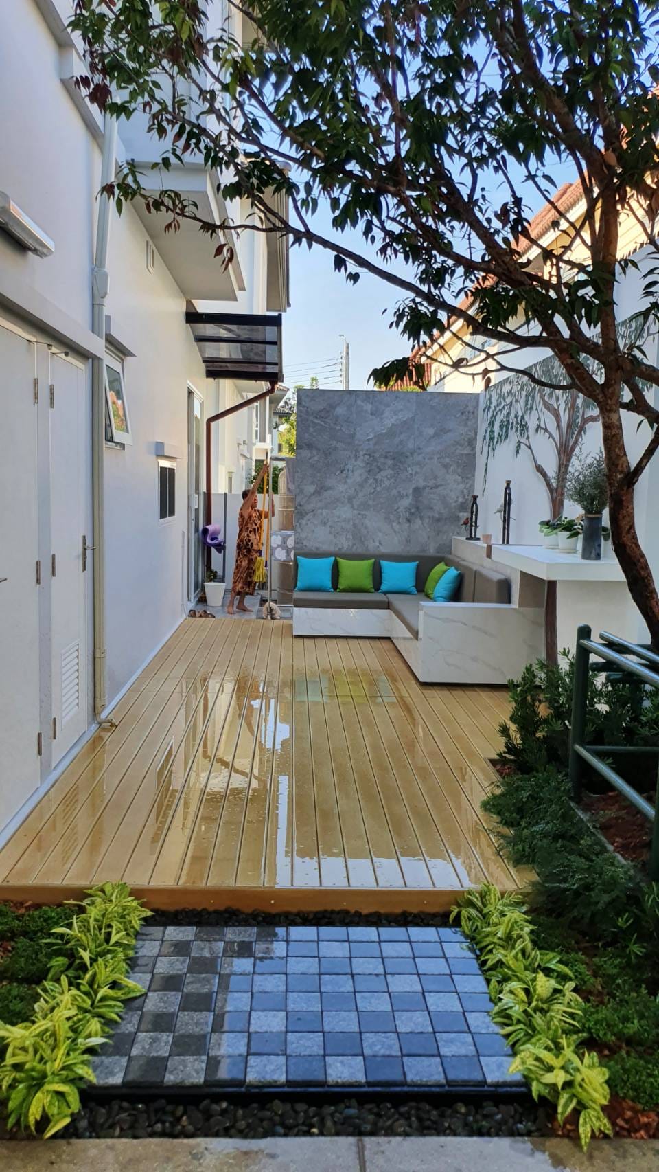 หลังจากผ่านการปรับปรุงและต่อเติมแล้ว จากพื้นที่สนามรก ๆ มาตอนนี้ก็กลายเป็นมุมพักผ่อนที่ดูสวยงามร่มรื่นกันแล้วล่ะ