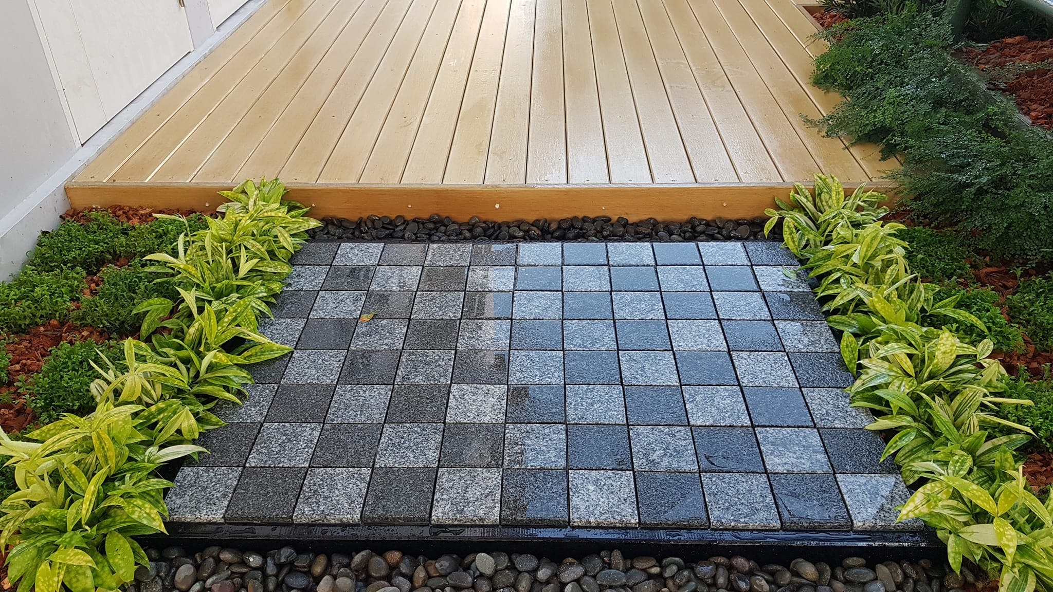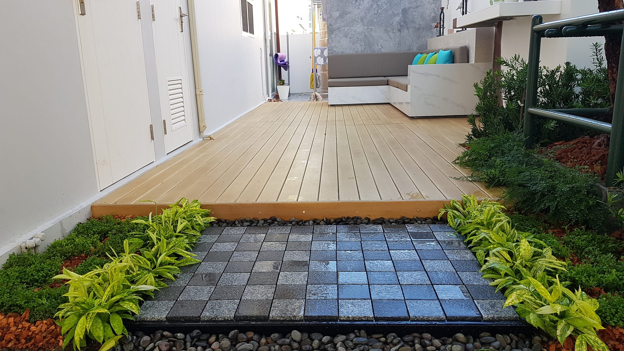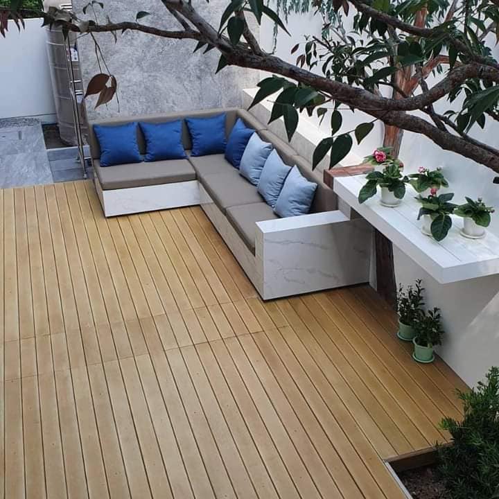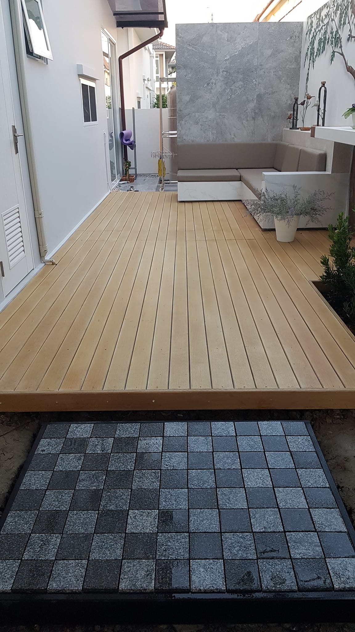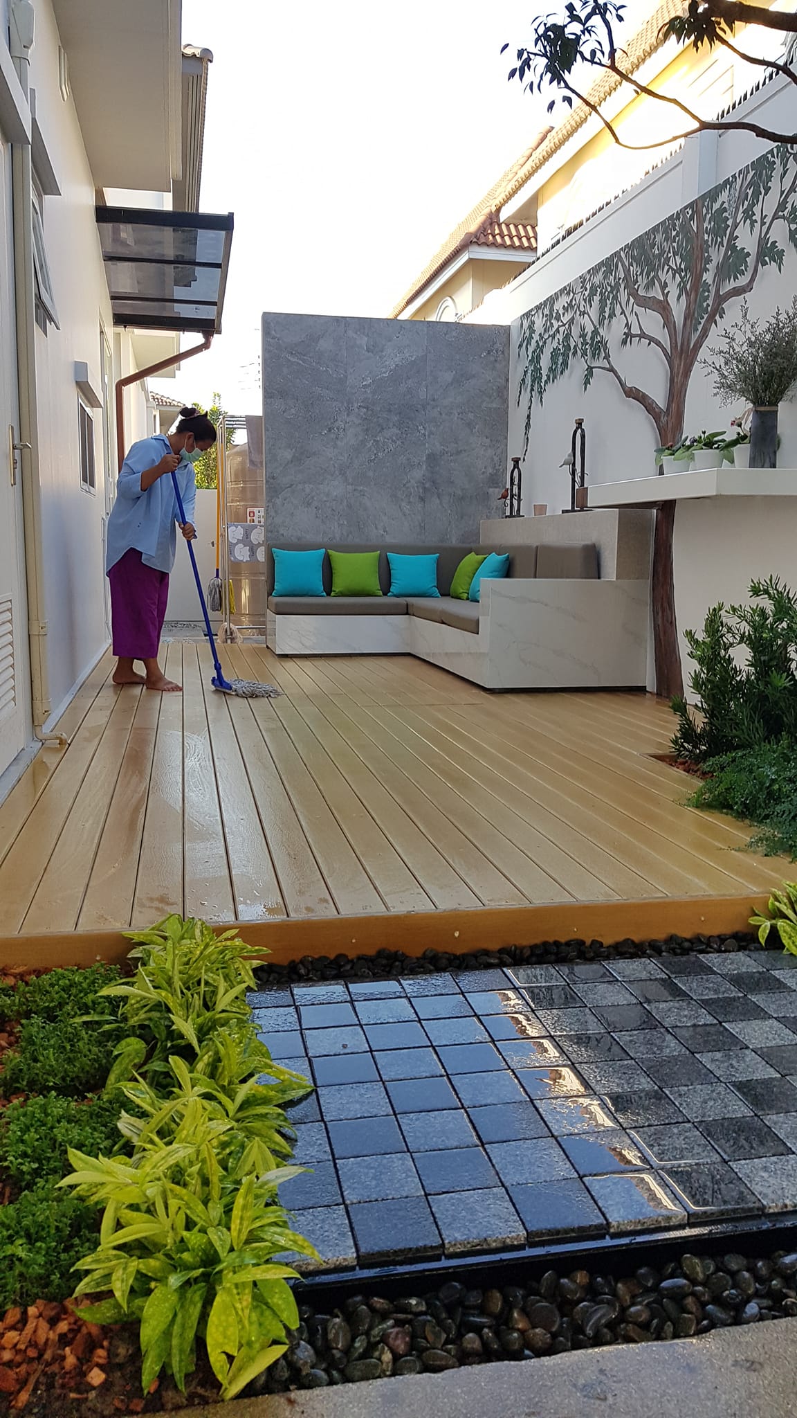 พื้นของเฉลียงเป็นไม้เทียม จึงสามารถดูแลทำความสะอาดได้ง่ายมาก ทั้งยังมีข้อดีกว่าพื้นไม้จริงตรงที่จะไม่เสี้ยนไม้ให้ตำเท้าเลย