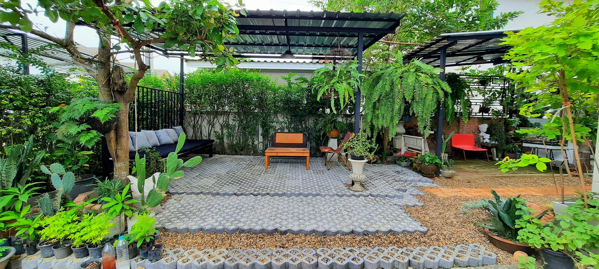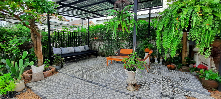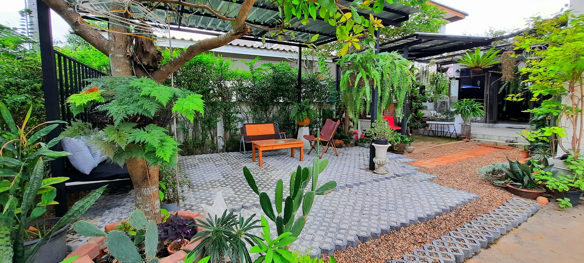 เจ้าของบ้านมีพื้นที่บริเวณหน้าบ้านที่ค่อนข้างกว้าง จึงได้ตกแต่งให้เป็นสวนหย่อม พร้อมกับเป็นมุมสำหรับนั่งเล่นไปในตัวอีกด้วย จึงออกแบบโดยการสร้างเป็นโครงหลังคา มีพื้นที่ใช้สอยด้านใน รอบ ๆ ตกแต่งด้วยพันธุ์ไม้นานาชนิดอย่างร่มรื่น