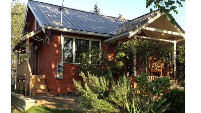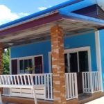 ตัวบ้านโครงสร้างไม้ ที่ออกแบบแปลนง่ายๆ แบบคอมแพ็คโฮม ใช้ผนังจากไม้เป็นตัวตกแต่ง หลังคาทรงจั่วชิ้นเล็ก ดูเสริมความน่ารักให้ตัวบ้านได้ดี หน้าบ้านมีเฉลียงเล็กไว้รับแขกก่อนเข้าบ้าน