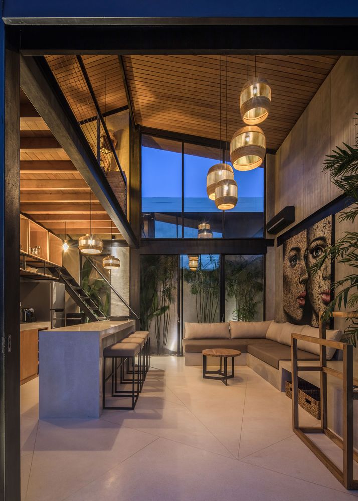 เมื่อเข้ามาภายในบ้าน เราก็จะพบกับห้องโถงหลักของบ้าน โดยภายในผสานการเลือกใช้วัสดุอย่างเหล็ก ปูนเปลือยและไม้ได้อย่างเข้ากัน ให้ดีไซน์แบบอินดัสเทียลได้อย่างชัดเจน