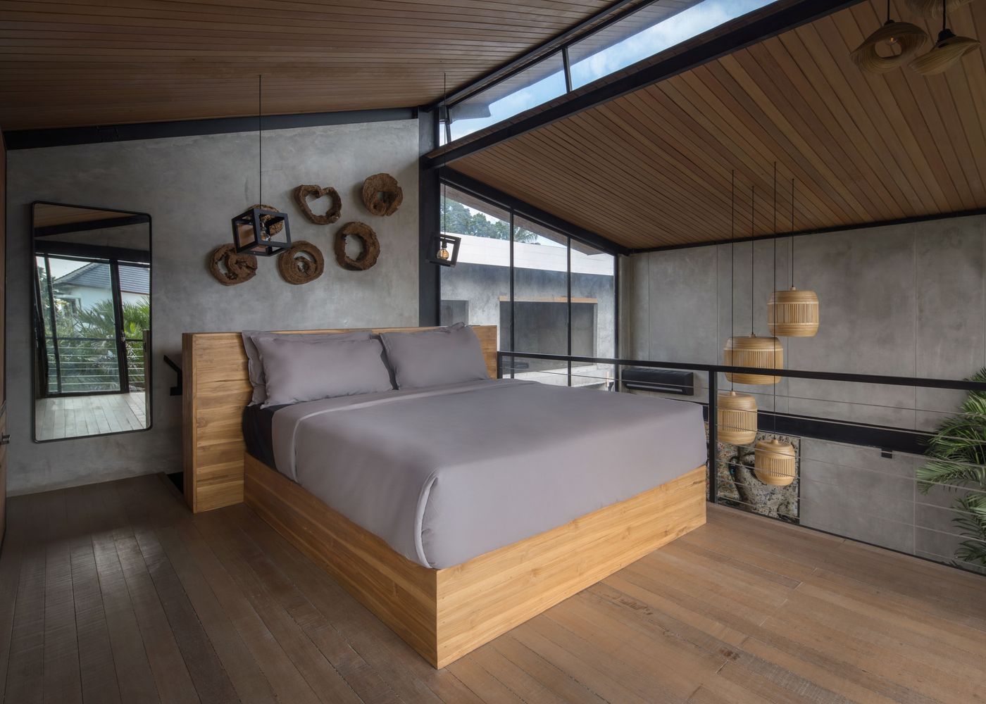 บริเวณชั้นลอฟท์ หรือชั้นลอย ถูกตกแต่งให้เป็นพื้นที่ของห้องนอน ด้านข้างมีมุมมองที่สามารถมองเห็นพื้นที่ด้านล่างได้อย่างชัดเจน เป็นห้องนอนที่เน้นความเปิดโล่งโดยเฉพาะเลยล่ะ