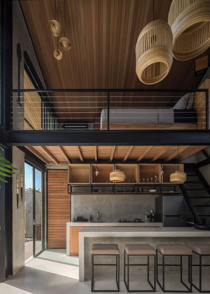 สำหรับห้องครัวนั้น จะตั้งอยู่ด้านล่างของห้องนอน โดยตัวห้องครัวมีดีไซน์และเฟอร์นิเจอร์ในแบบโมเดิร์น ที่ผสานการตกแต่งแบบอินดัสเทรียลได้อย่างสวยงาม