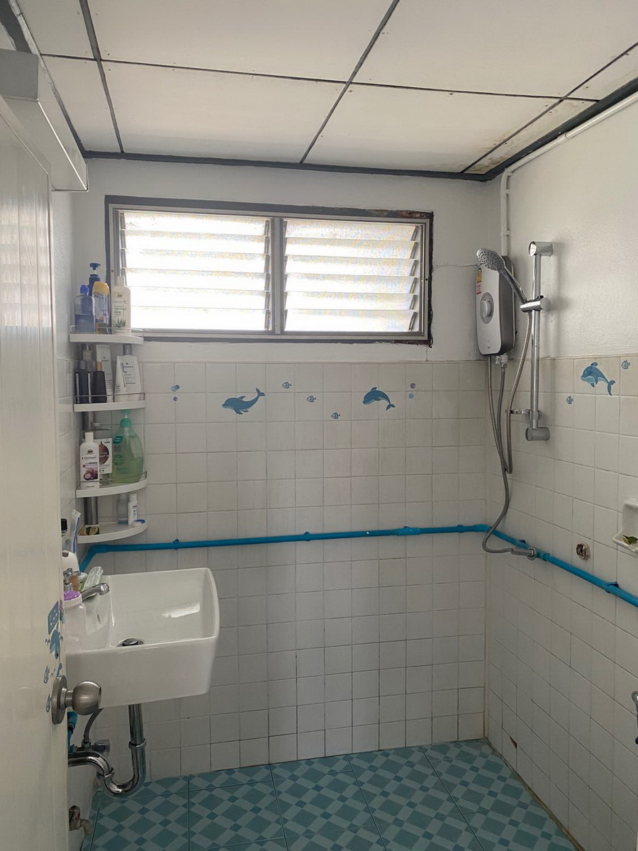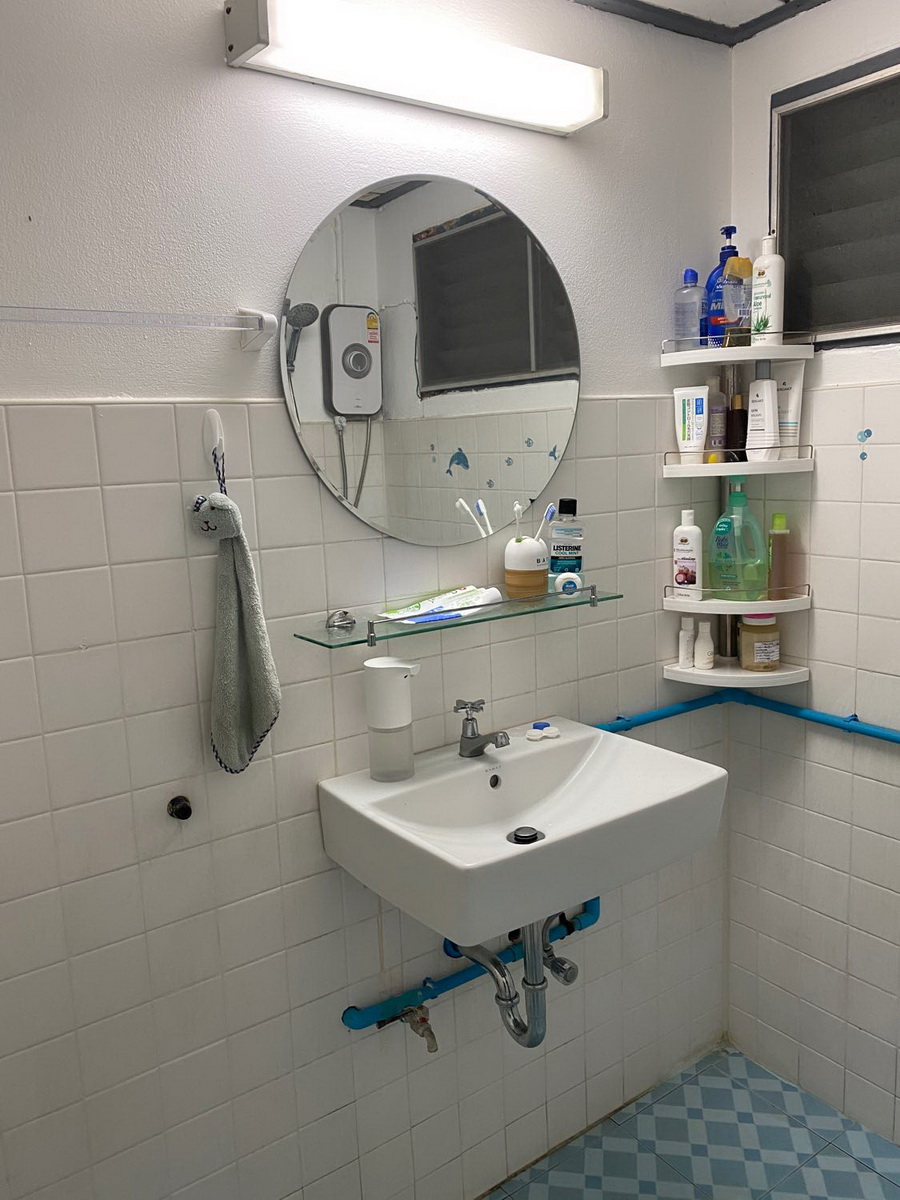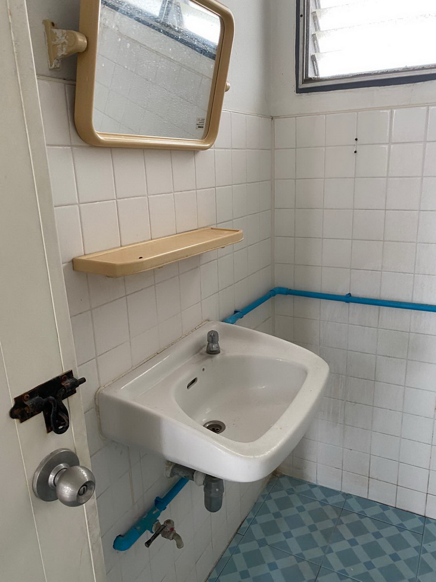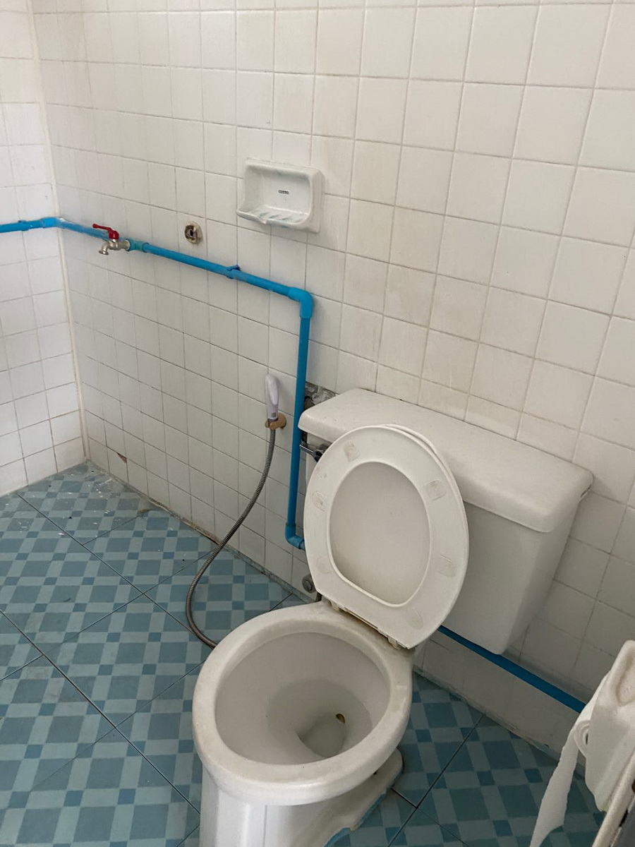 ท่อน้ำในห้องน้ำภายในรั่วหมด ถ้าจะเปลี่ยนต้องรื้อผนัง ก็เลยได้แค่เดินท่อออกมาด้านนอกแบบนี้แทน