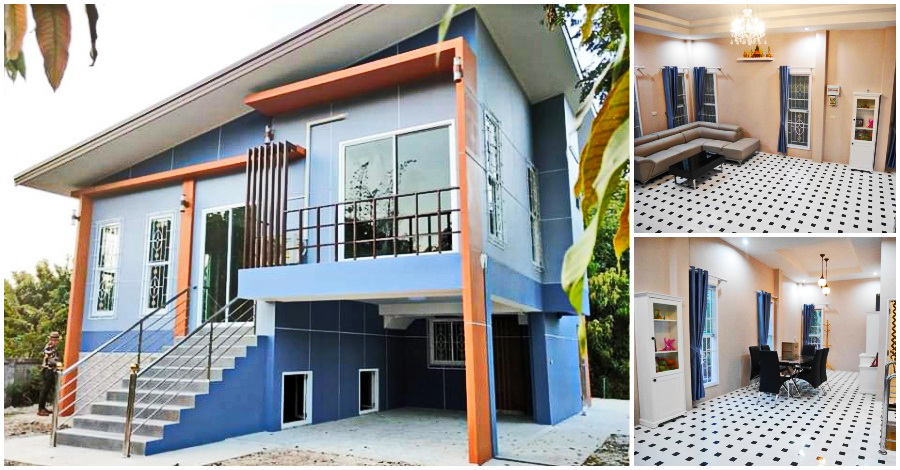 บ้านหลังนี้เป็นผลงานจากคุณ Home Fa เป็นบ้านชั้นเดียวยกพื้นสูง โครงสร้างบ้านคอนกรีตเสริมเหล็ก ภายนอกแต่งแต้มด้วยโทนสีฟ้าคราม ตัดด้วยครีบปูนสีส้มดูโดดเด่น หลังคามุงเมทัลชีททรงเพิงหมาแหงน ใต้ถุนบ้านมีพื้นที่โล่งกว้างสำหรับใช้งานอเนกประสงค์