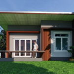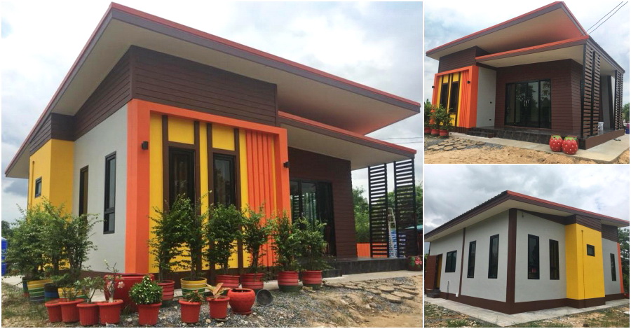 สำหรับบ้านหลังนี้ เป็นบ้านขนาดชั้นเดียว ตัวบ้านดีไซน์รูปทรงสี่เหลี่ยม หลังคารูปทรงเพิงหมาแหงน ทางด้านของผนังภายนอกบ้านถูกตกแต่งด้วยสีน้ำตาลเข้มยืนพื้น เพิ่มลูกเล่นด้วยสีเหลือง และส้ม เพื่อเพิ่มความสะดุดตา
