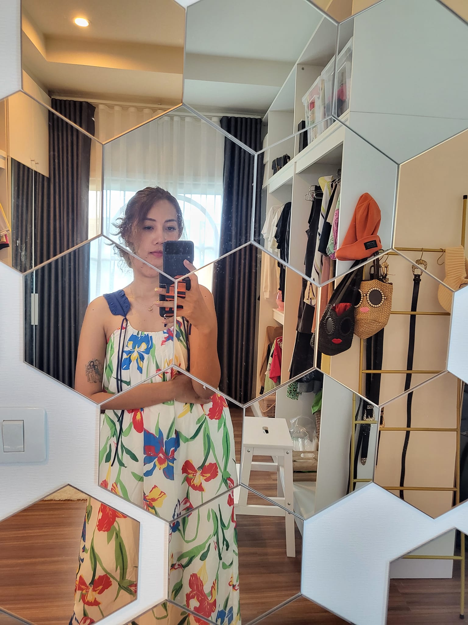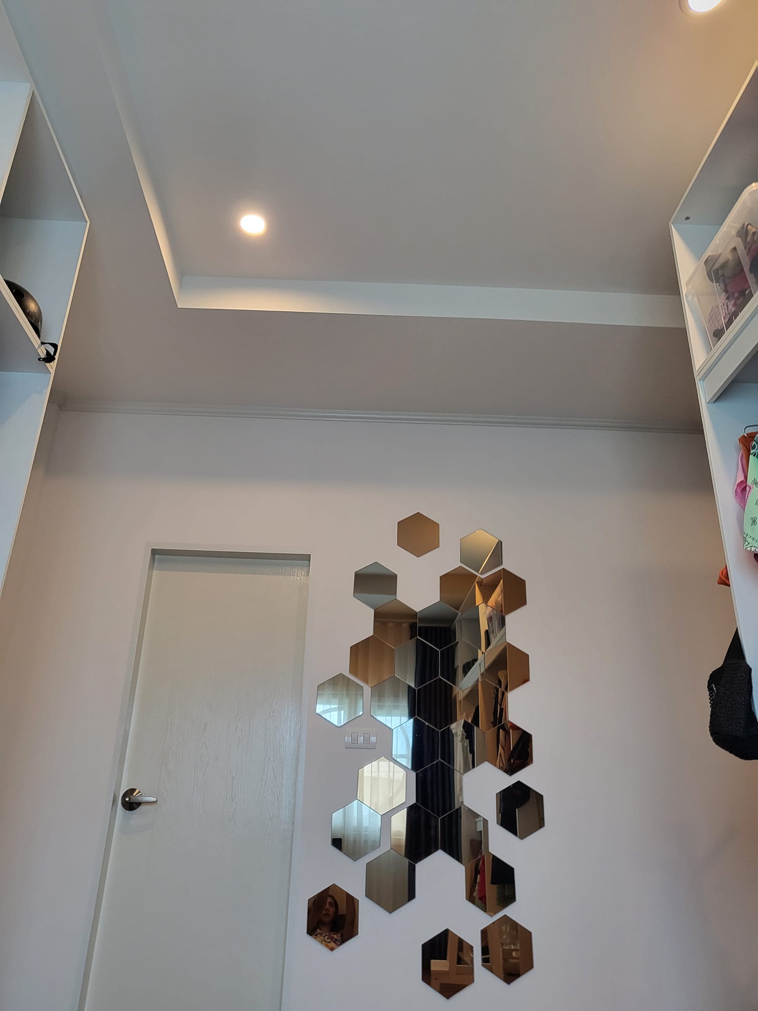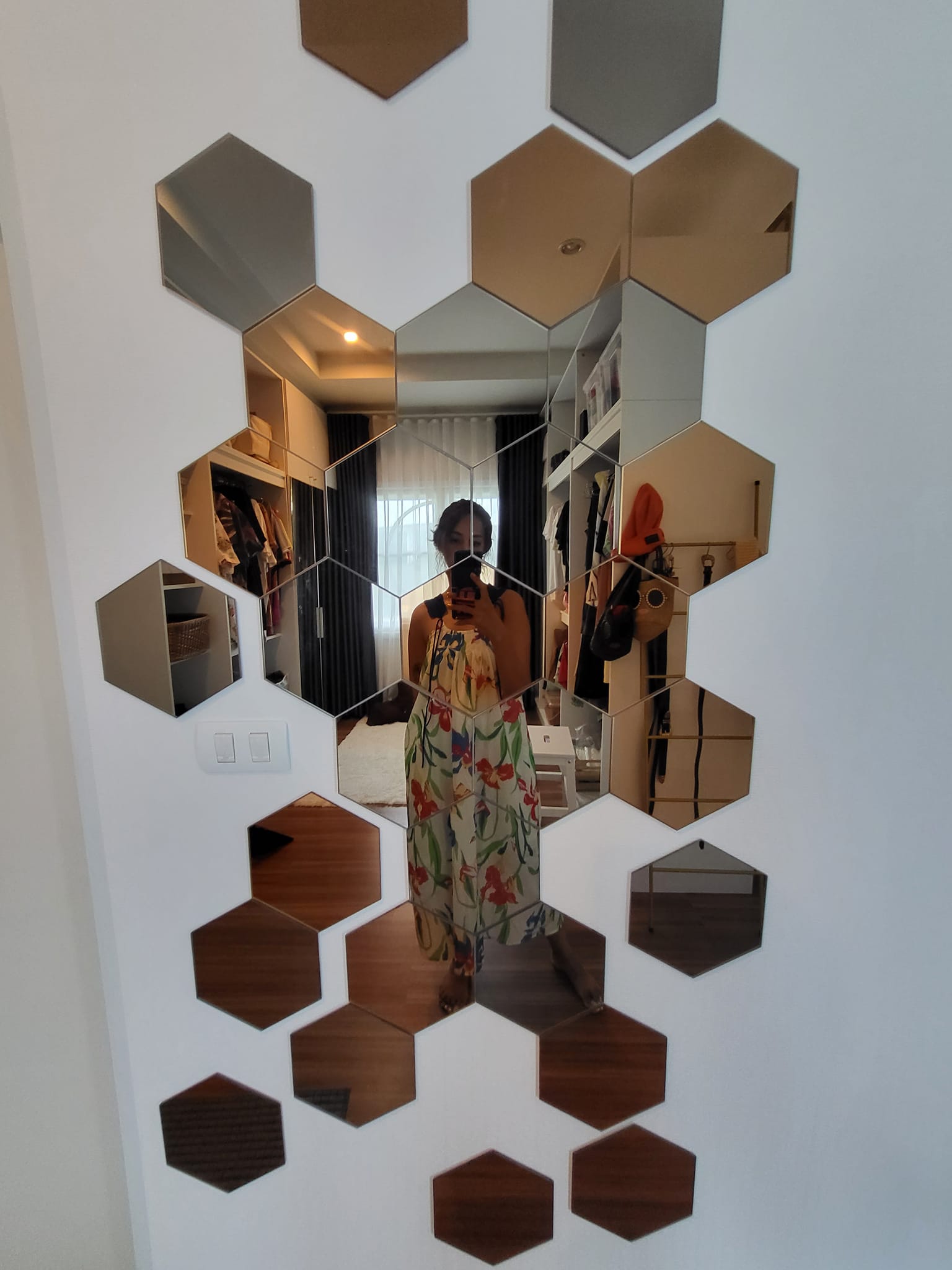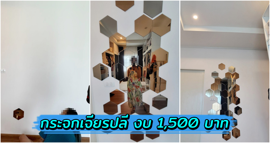 ซึ่งการตกแต่งนั้น เดิมดีเจ้าของอยากจะได้กระจกเจียรปลีมาตกแต่ง แต่กระจกแบบนี้จะมีราคาที่สูงพอสมควร เธอจึงได้เปลี่ยนมาใช้กระจกจาก IKEA มาใช้กระจกรังผึ้งตกแต่งผนังแทน ซึ่งมีราคาถูกกว่า และสามารถติดเองได้ไม่ยาก