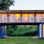 ตัวบ้านโครงสร้างเหล็ก ออกแบบรูปทรงของบ้านแบบทรงกล่องสี่เหลี่ยม ที่ดูเรียบง่าย ซ้อนกันให้มีจังหวะ ยกพื้นสูงพองาม มีส่วนยื่นลอยออกมา และช่วยให้บ้านดูเบาอารมณ์ลง