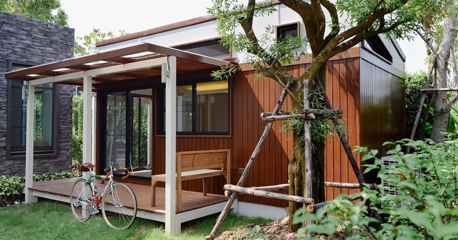 ในส่วนของการตกแต่งภายนอกจะใช้ไม้เป็นวัสดุหลักเพื่อให้ดูกลมกลืนไปกับธรรมชาติบริเวณรอบบ้าน