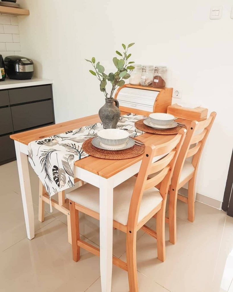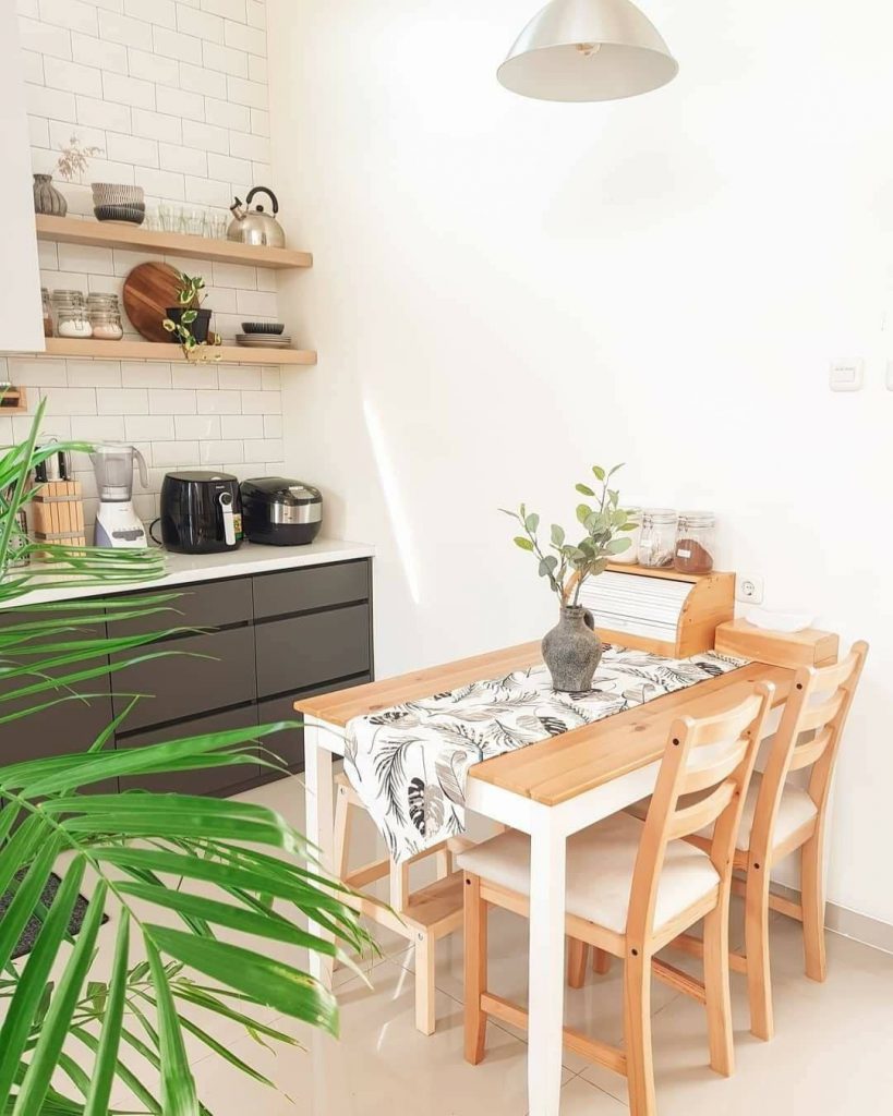 มุมรับประทานอาหารของบ้านตกแต่งด้วยโต๊ะไม้สีน้ำตาลอ่อน ซึ่งให้ธีมที่สะท้อนความเป็นมินิมอลได้อย่างเด่นชัดและมีความสวยงาม