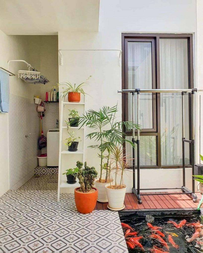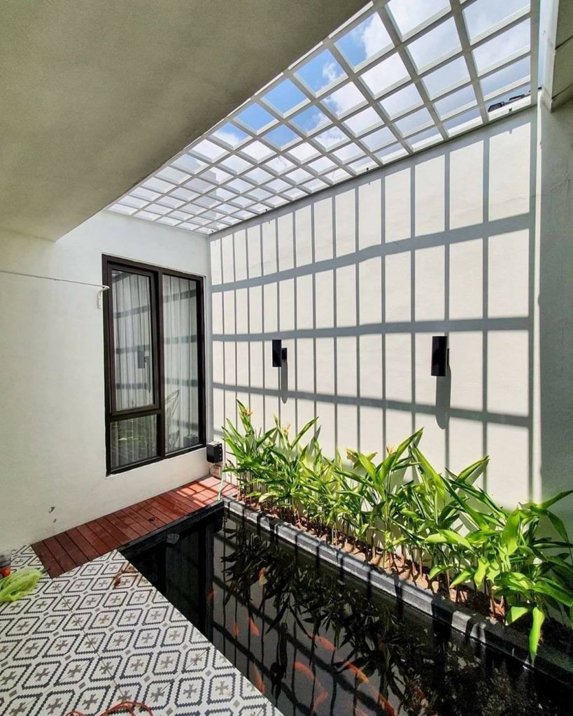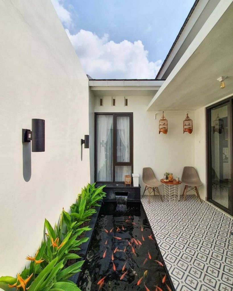 ภายในบริเวณบ้านเจ้าของบ้านได้ออกแบบมุมพักผ่อนตรงนี้เอาไว้ โดยจะประกอบไปด้วยบ่อเลี้ยงปลา รวมถึงพื้นที่สำหรับนั่งเล่น เหมาะกับหลบมาอ่านหนังสือ หรือจิบกาแฟยามบ่าย
