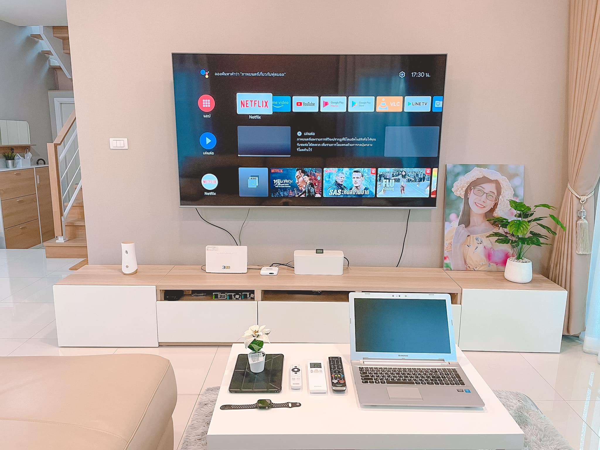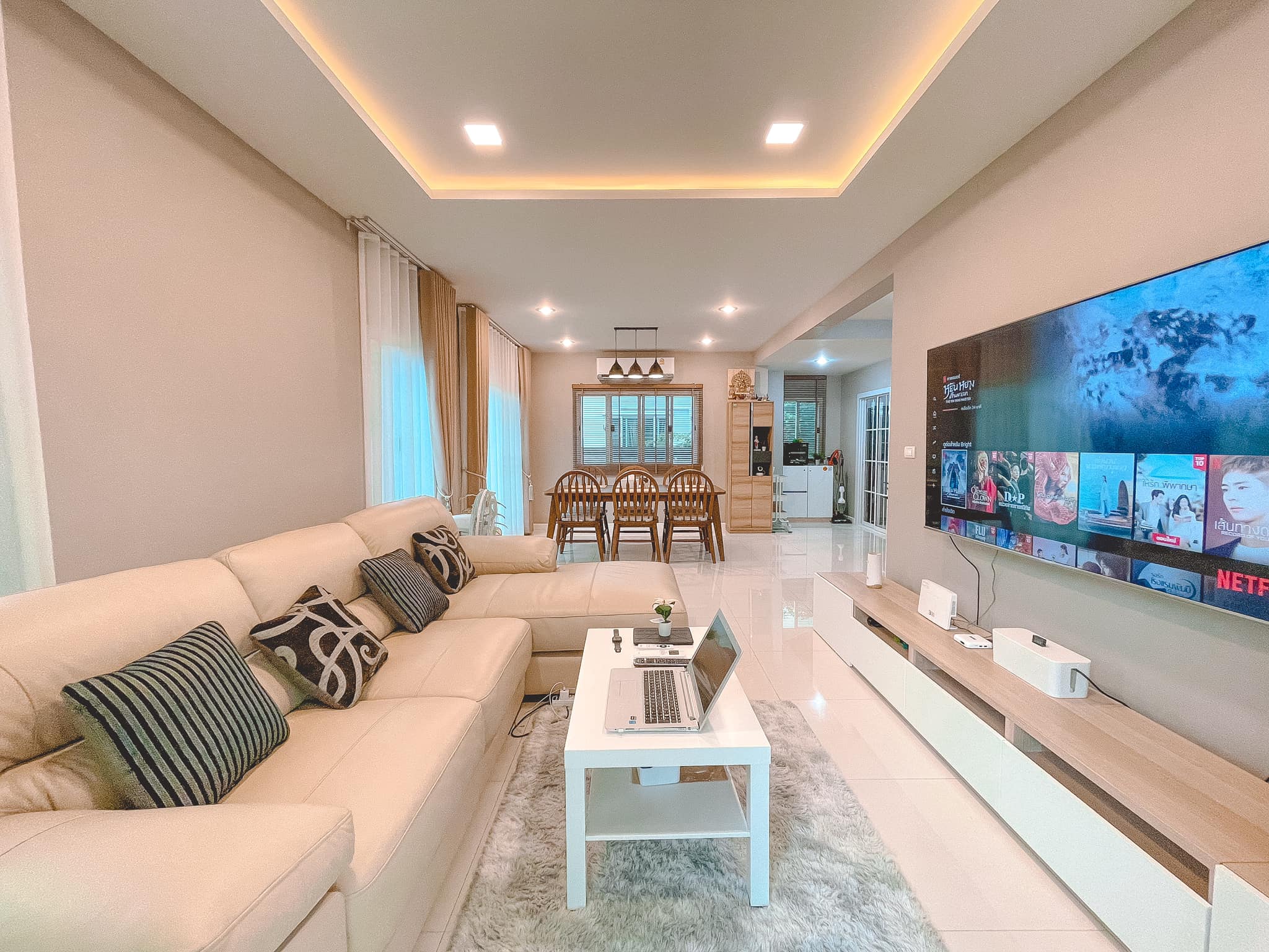 มาเริ่มต้นกันที่ห้องนั่งเล่นกันก่อนเลย ภายในห้องนี้ก็จะมีโทนสีครีมที่ช่วยสร้างบรรยากาศที่อบอุ่นเป็นโทนสีหลัก โดยมุมนี้ก็จะตกแต่งด้วยโซฟาชุดใหญ่ในโทนสีเดียวกับห้อง มีโต๊ะสีขาวและทีวีจอยักษ์ที่จะช่วยสร้างความบันเทิงได้เป็นอย่างดี