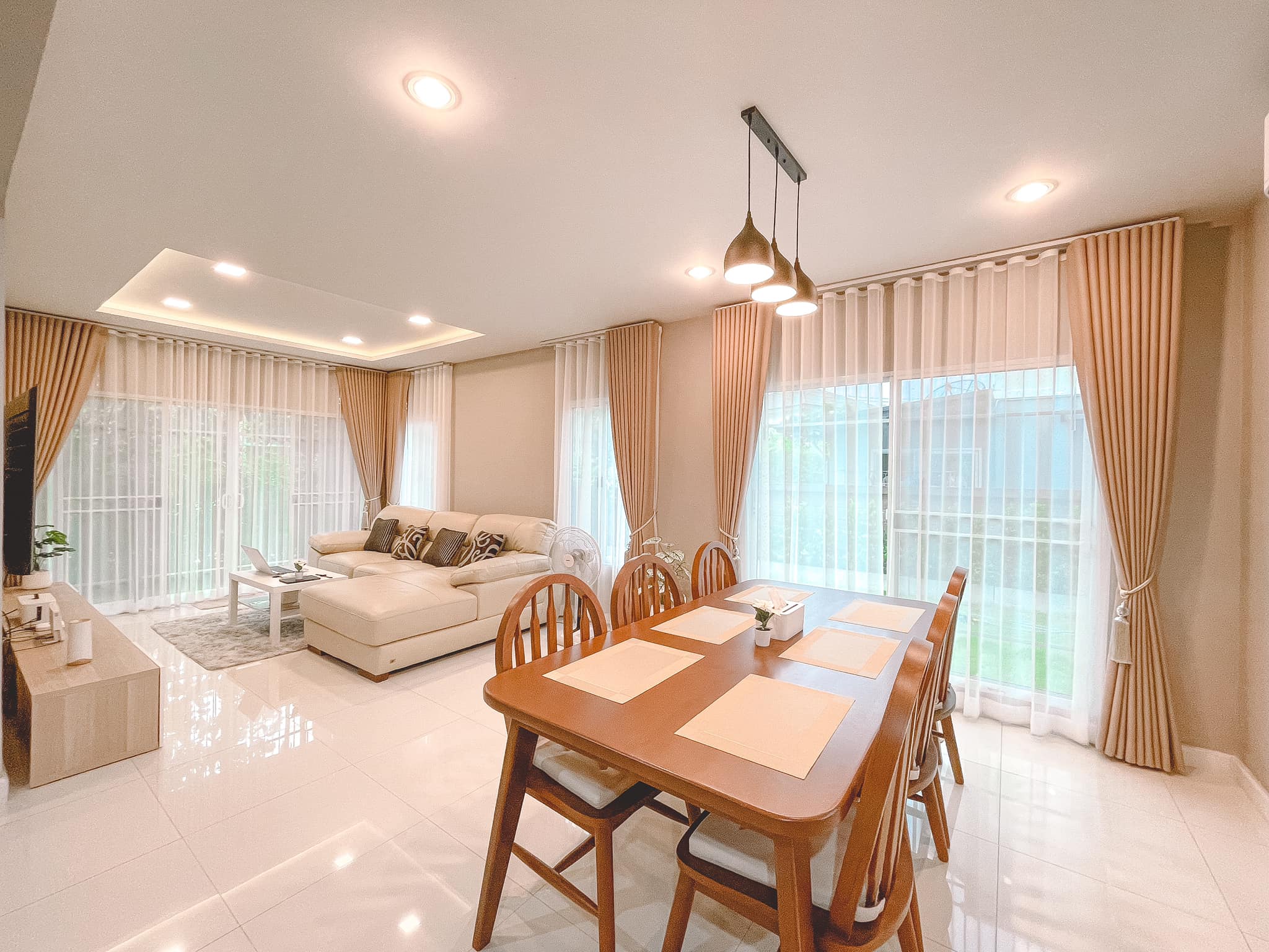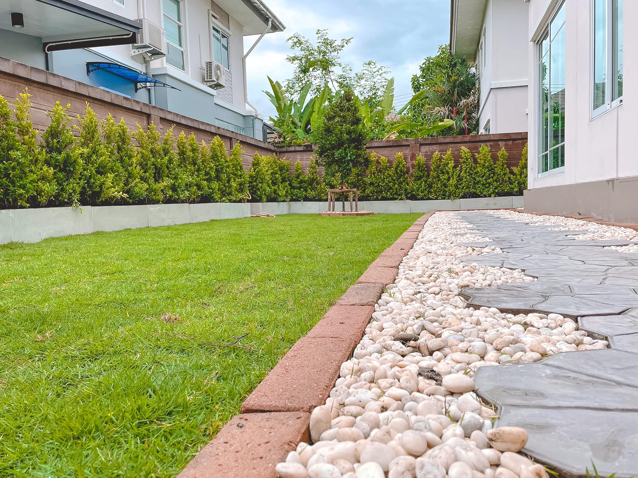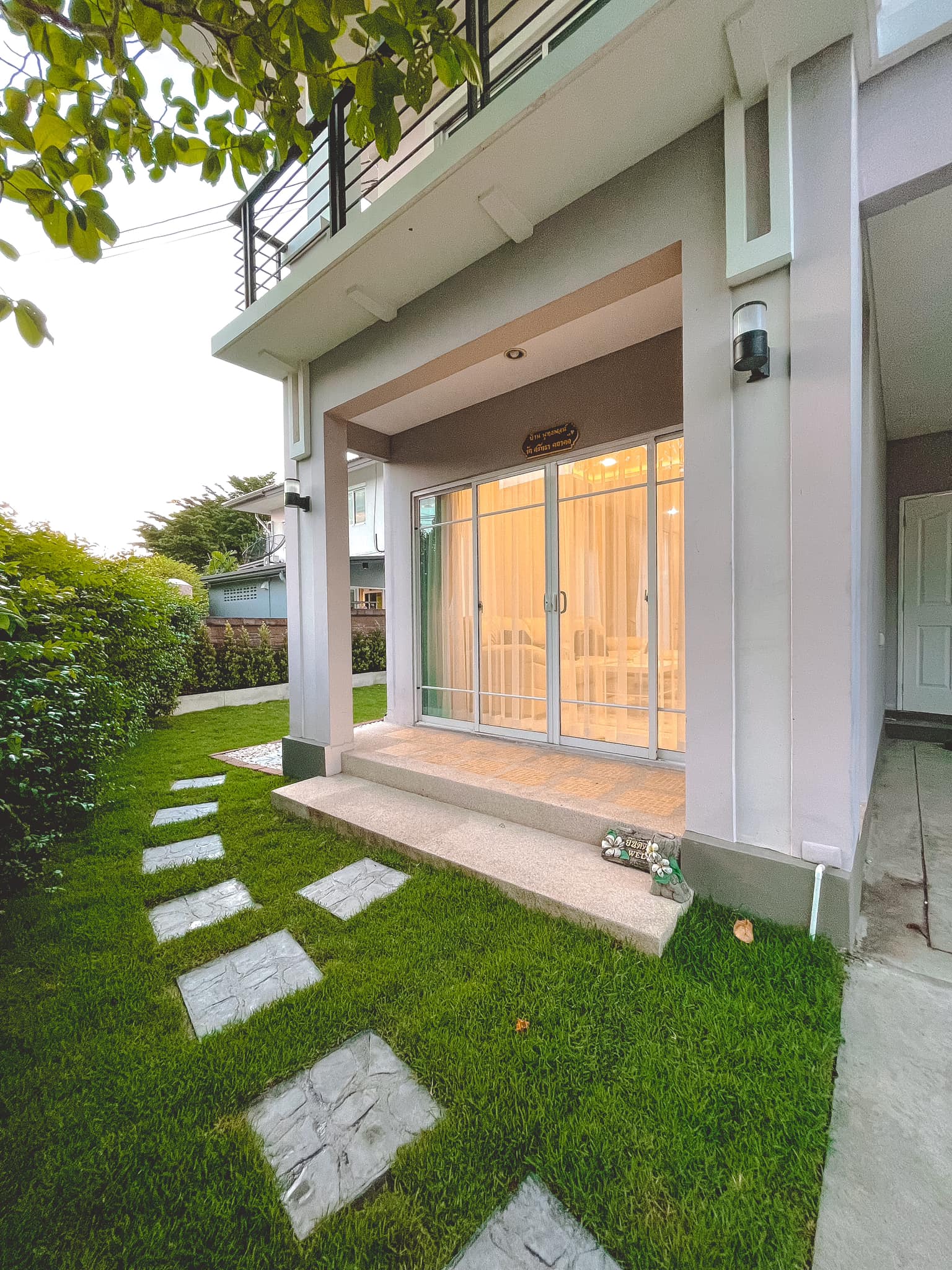 ไม่เพียงแต่ภายในบ้านเท่านั้น พื้นที่บริเวณนอกบ้านยังถูกตกแต่งและจัดสวนด้วยสนามหญ้าสีเขียว มีพื้นที่ให้ใช้สอยกันอย่างกว้างขวาง