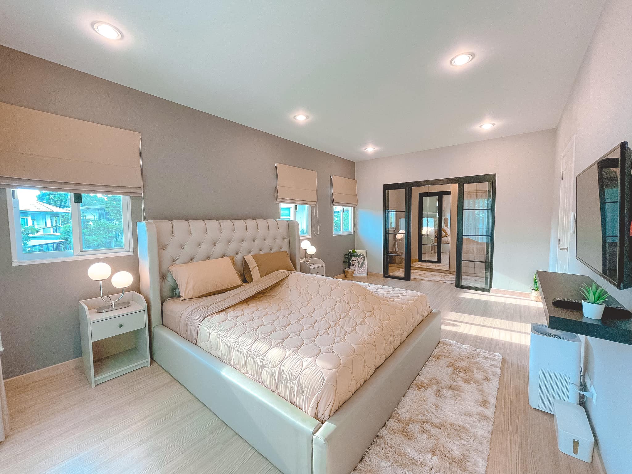 ภายในห้องนอนนั้น มีพื้นที่ใช้สอยที่ค่อยข้างกว้าง แถมยังเน้นการตกแต่งในแบบที่โปร่งสบายอีกด้วย จึงเหมาะกับการเป็นพื้นที่เพื่อการพักผ่อนอย่างแท้จริง