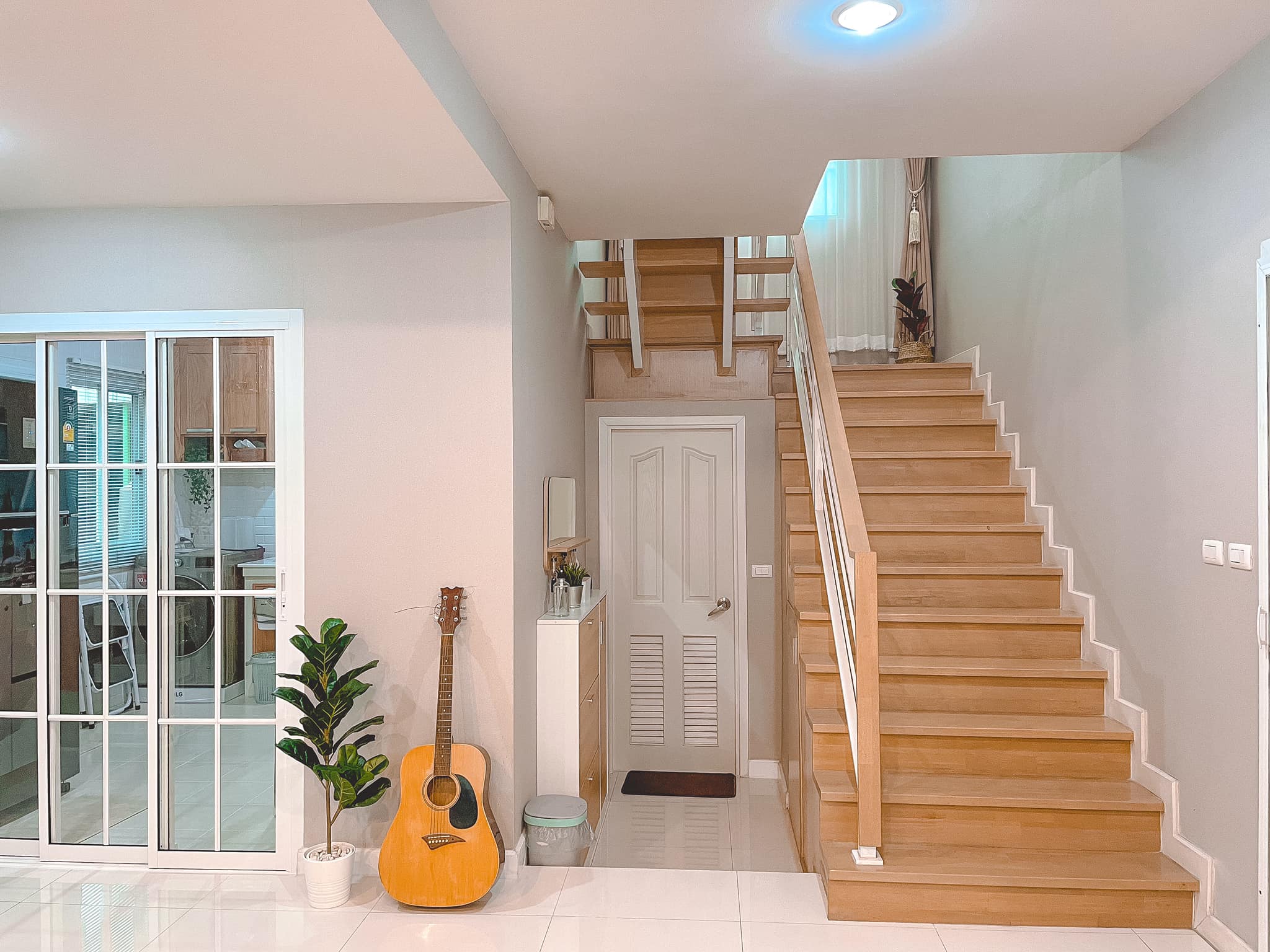 มุมนี้จะเป็นโถงที่เราสามารถมองเห็นพื้นที่ต่าง ๆ ของบ้านได้ จากทางซ้ายก็จะเป็นห้องครัวที่มีประตูบานเลื่อนกั้นเอาไว้อย่างเป็นสัดส่วน ตรงกวางเป็นห้องน้ำ และทางขวาสุดก็จะเป็นบันไดที่ทอดไปยังพื้นที่ชั้นสองนั่นเอง
