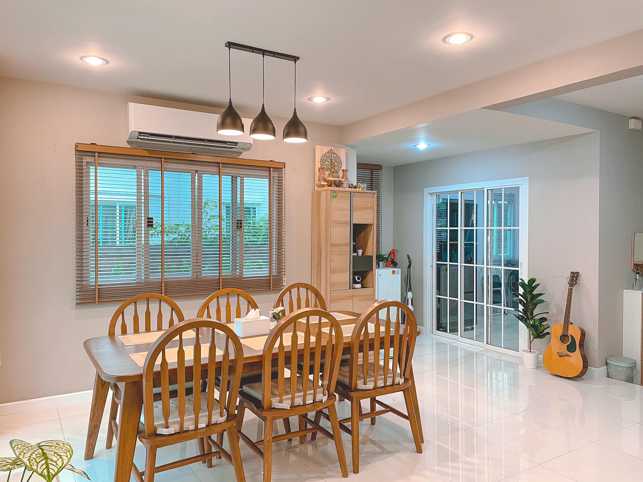 มุมนี้จะเป็นพื้นที่โต๊ะรับประทานอาหารที่ให้บรรยากาศที่อบอุ่นสุด ๆ ผ่านการตกแต่งด้วยเฟอร์นิเจอร์ไม้ รวมไปถึงโคมไฟที่ให้แสงสีนวลตา