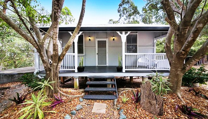 บ้านชั้นเดียวสีขาว ยกสูงจากพื้นเล็กน้อย ผนังภายนอกตกแต่งด้วยไม้ฝา ชานหน้าบ้านเปิดโล่ง ปูพื้นไม้สีดำ ตัดกันกับตัวบ้านได้เป็นอย่างดี มีการจัดมุมเก้าอี้ไว้สำหรับนั่งเล่น พบป่ะเพื่อนฝูง ที่มาเยี่ยมเยียนในแต่ละวัน