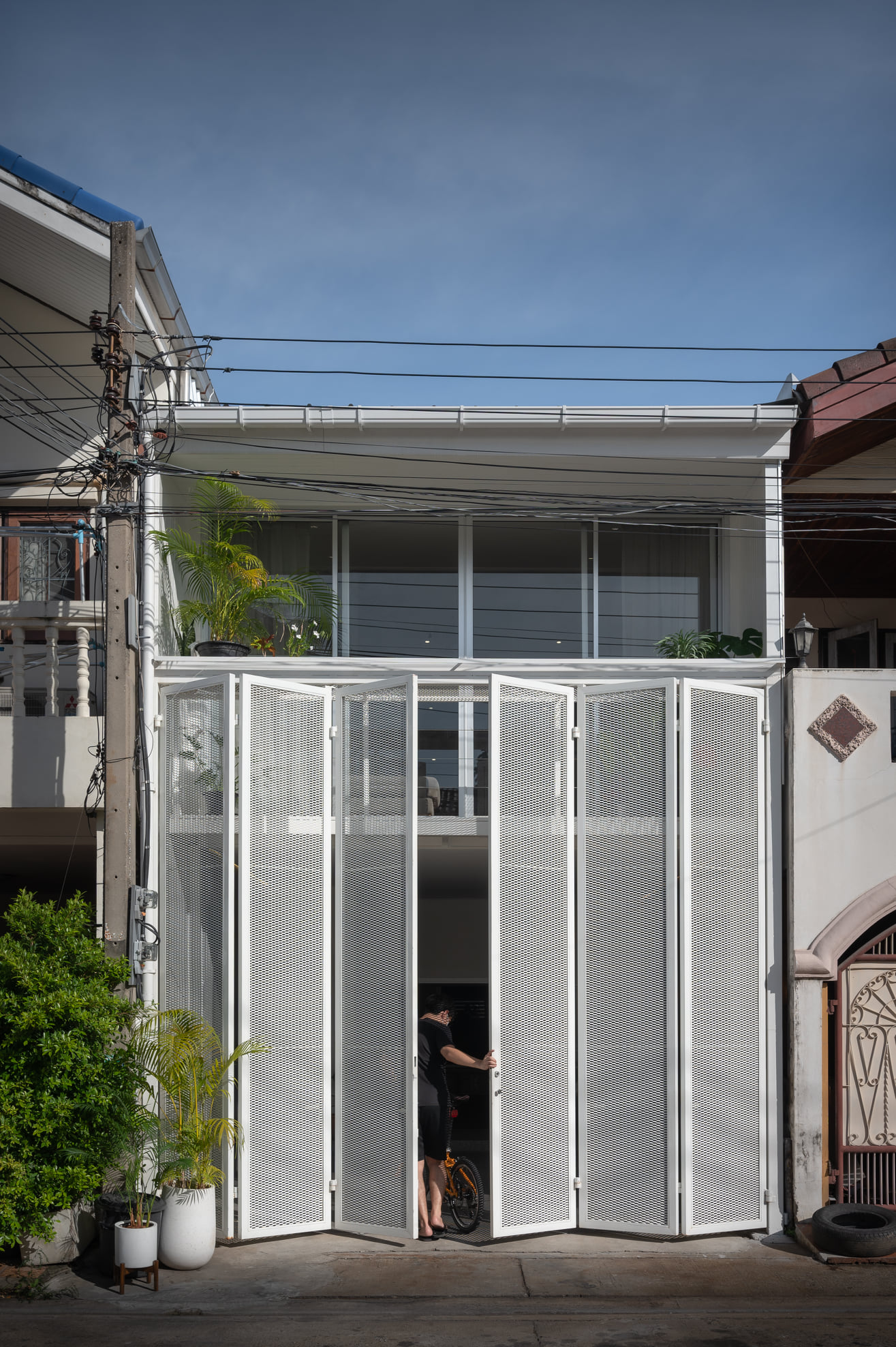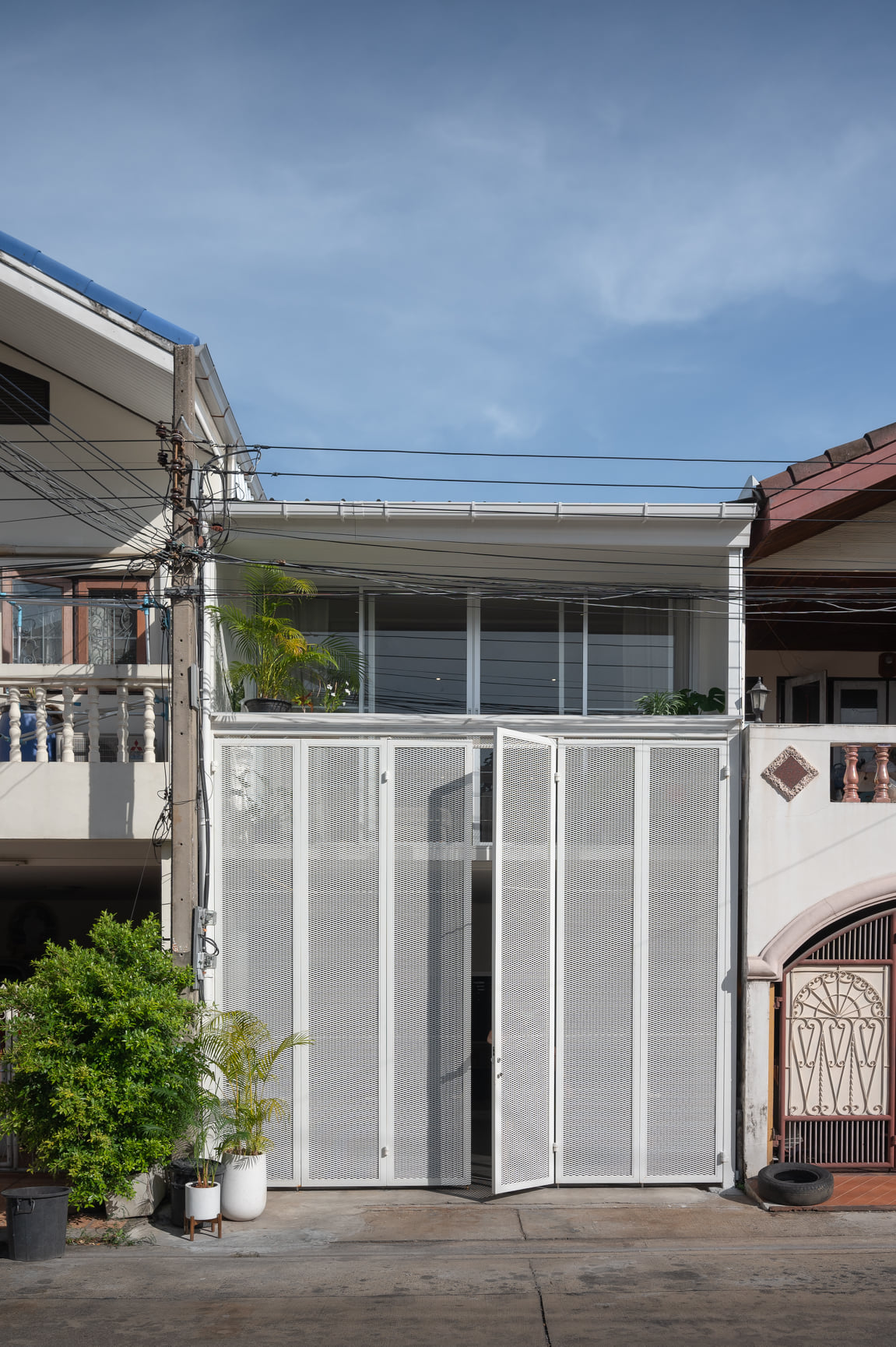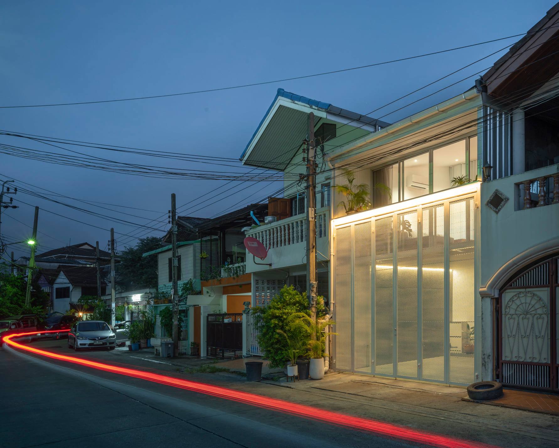 ด้านหน้าของบ้านนั้นถือเป็นช่องทางหลักที่แสงและลมจะเข้าถึงพื้นที่ภายใน ซึ่งจะมาพร้อมกับความร้อนและความไม่เป็นส่วนตัวด้วยเช่นกัน เพื่อแก้ปัญหาดังกล่าว ประตูรั้วจึงถูกออกแบบเป็นประตูบานพับทรงสูงโดยเลือกใช้วัสดุแผ่นตะแกรงเหล็กฉีกเพื่อบดบังสายตาจากภายนอก โดยในขณะเดียวกันแสงและลมก็สามารถผ่านเข้าไปยังพื้นที่ภายในบ้านได้