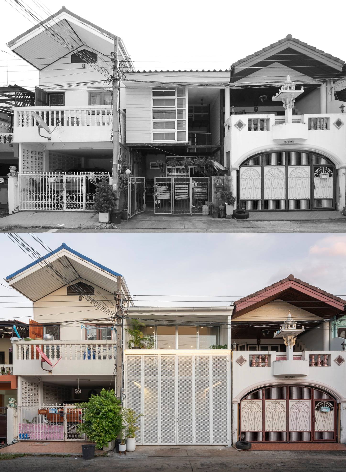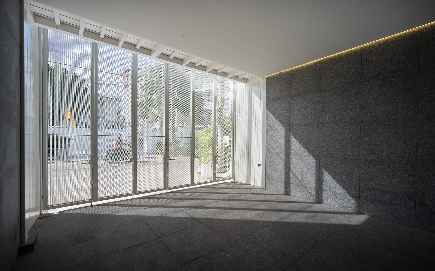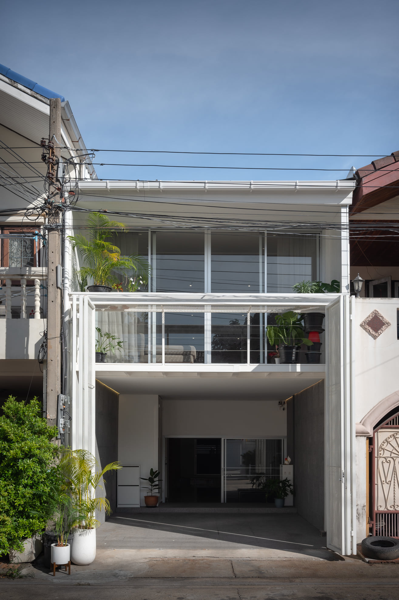 ด้านหน้าของบ้านนั้นถือเป็นช่องทางหลักที่แสงและลมจะเข้าถึงพื้นที่ภายใน ซึ่งจะมาพร้อมกับความร้อนและความไม่เป็นส่วนตัวด้วยเช่นกัน เพื่อแก้ปัญหาดังกล่าว ประตูรั้วจึงถูกออกแบบเป็นประตูบานพับทรงสูงโดยเลือกใช้วัสดุแผ่นตะแกรงเหล็กฉีกเพื่อบดบังสายตาจากภายนอก โดยในขณะเดียวกันแสงและลมก็สามารถผ่านเข้าไปยังพื้นที่ภายในบ้านได้