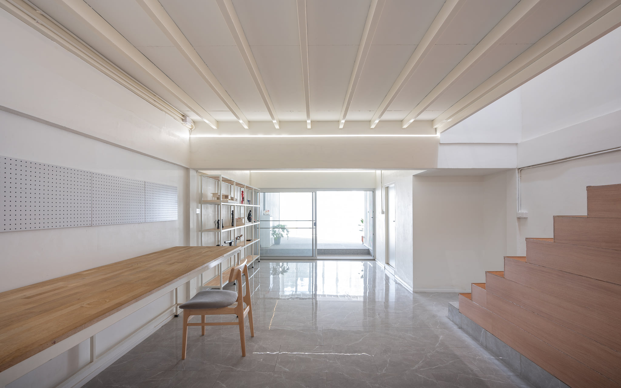 พื้นที่ห้องสตูดิโอสำหรับการทำงาน พื้นที่ส่วนใหญ่ถูกปล่องไว้โล่ง ๆ ในขณะที่ผนังด้านข้างถูกออกแบบให้เป็นเคาน์เตอร์สำหรับทำงาน รวมถึงมีชั้นวางไว้ใช้งานแบบเอนกประสงค์อีกด้วย