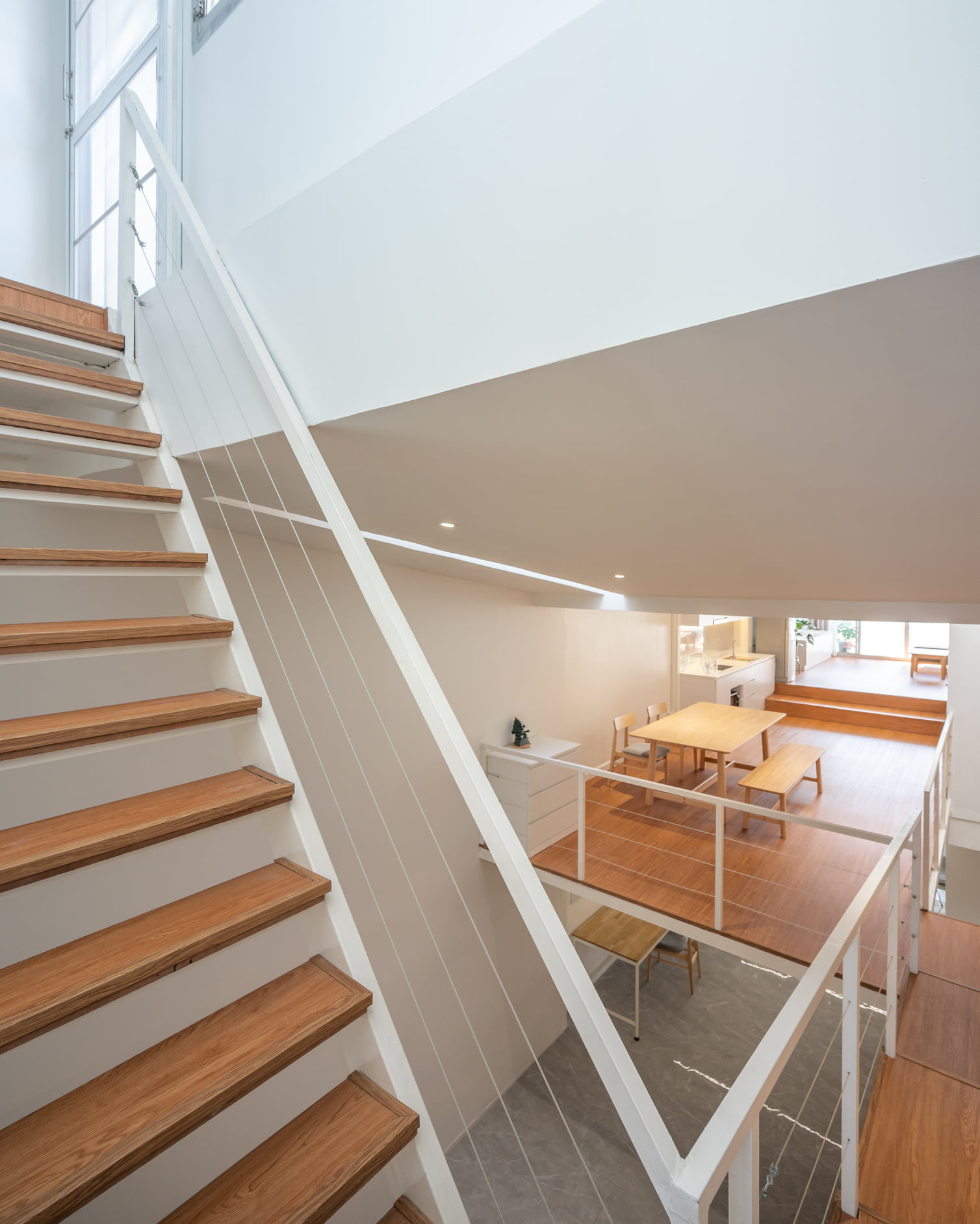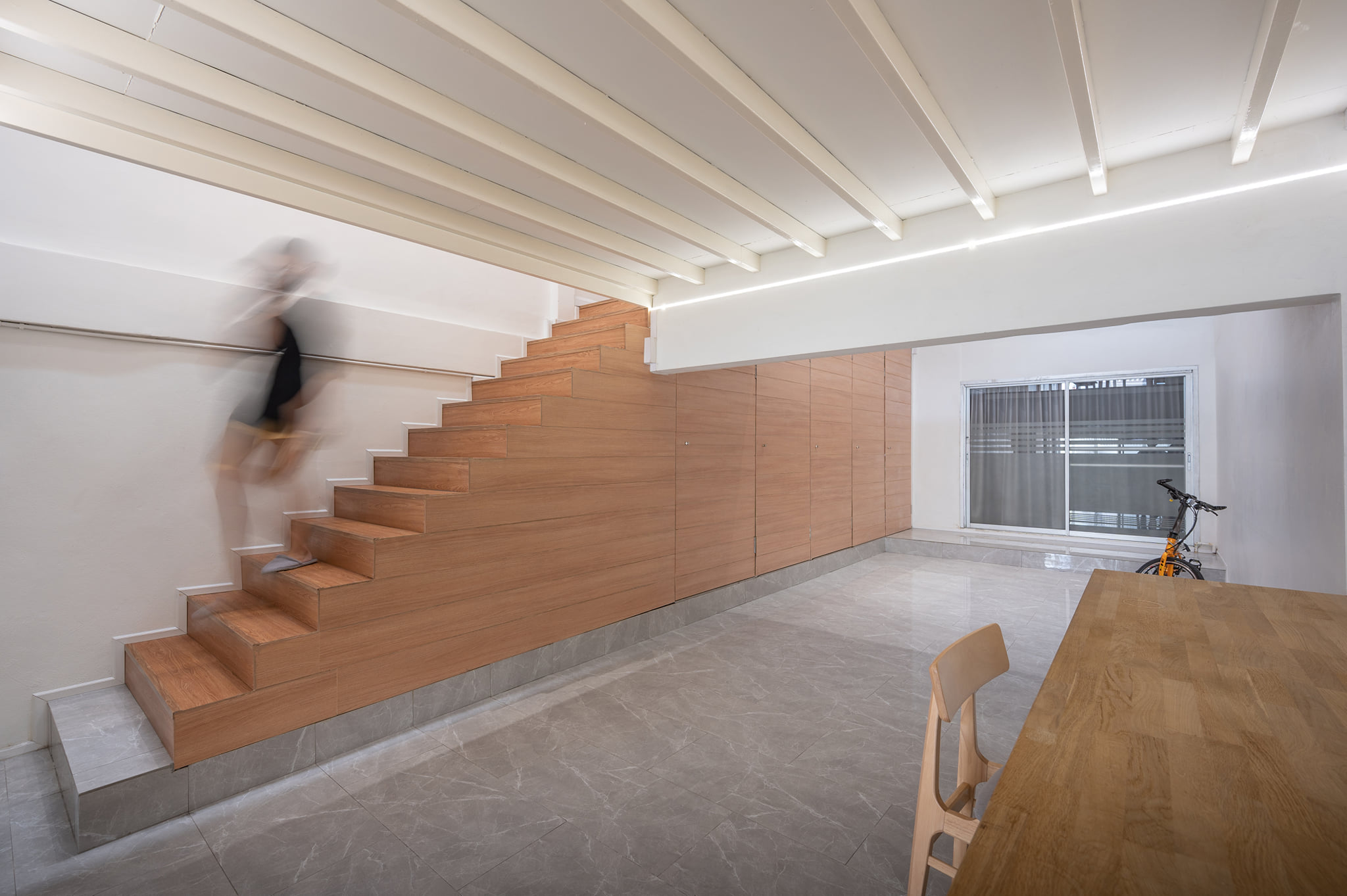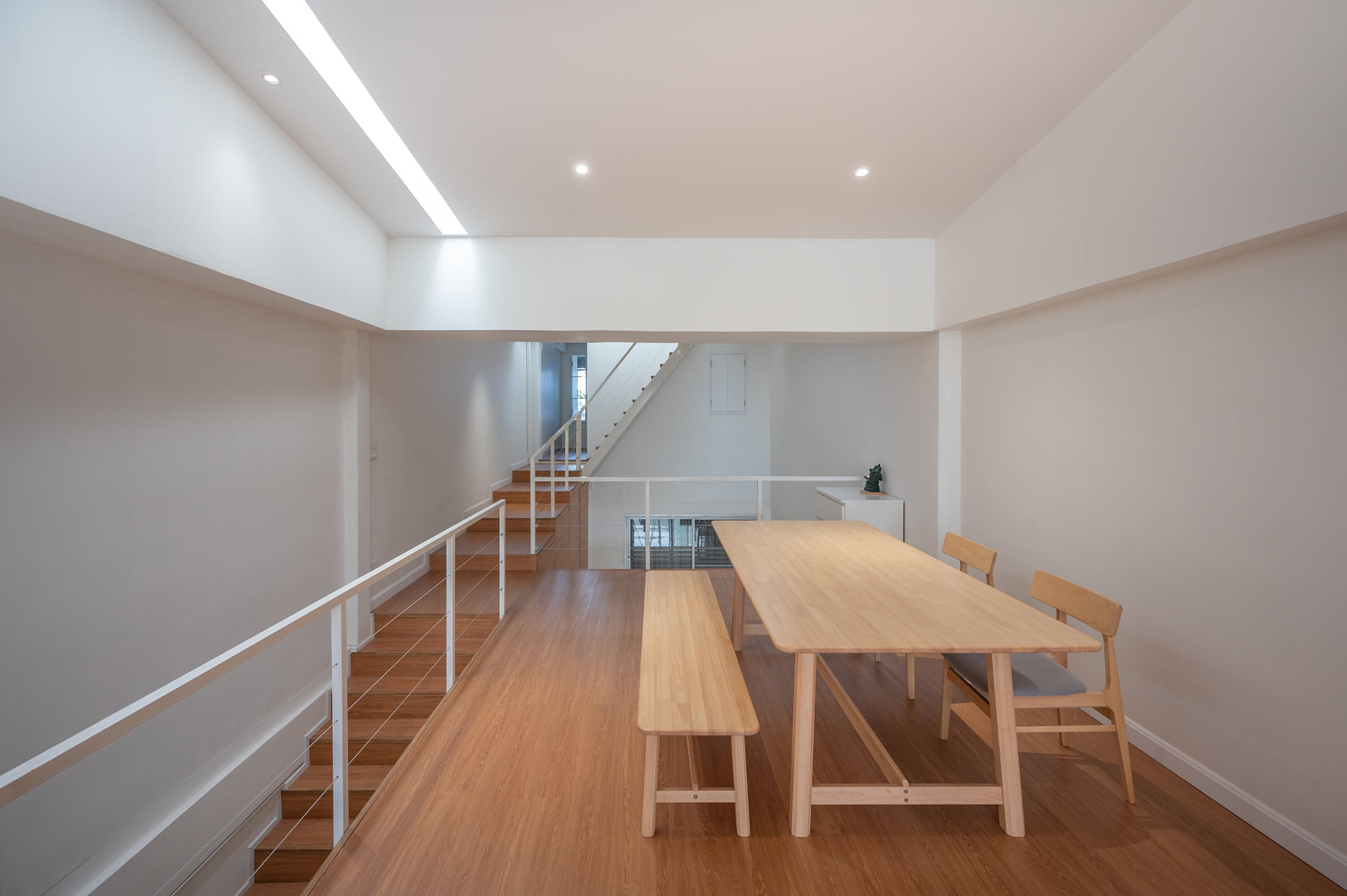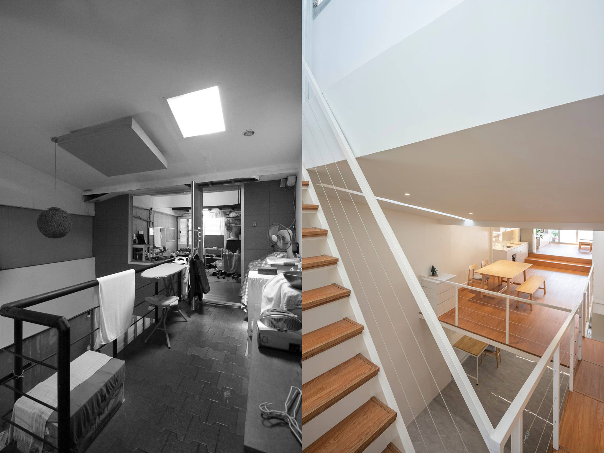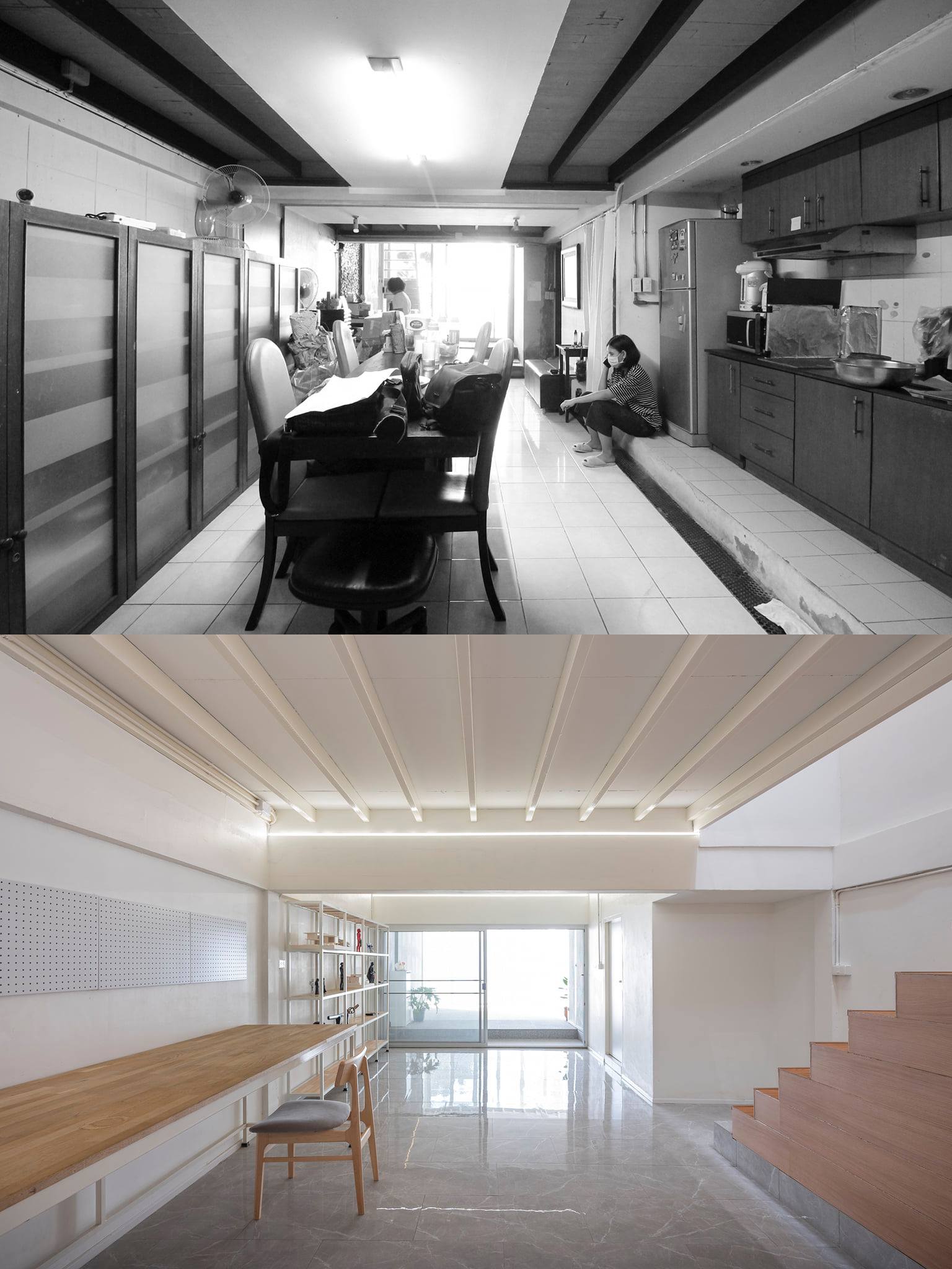 ทั้งด้วยลักษณะของบ้านแถวที่ทำให้แสงและลมเข้าถึงพื้นที่ภายในบ้านได้อย่างจำกัด ผู้ออกแบบจึงออกแบบให้ภายในบ้านมีช่องแสงด้านบน และเลือกใช้วัสดุพื้นผิวภายในเป็นสีขาวตัดกับวัสดุไม้เพื่อทำให้พื้นที่ภายในบ้านดูกว้างขึ้น
