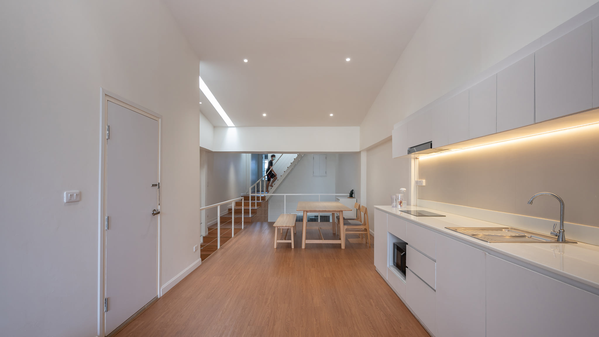 พื้นที่ของห้องครัวและพื้นที่รับประทานอาหารตั้งอยู่ในห้องโถงยาว บรรยากาศภายในห้องมีความปลอดโปร่ง มีแสงที่พอเหมาะสบายตา
