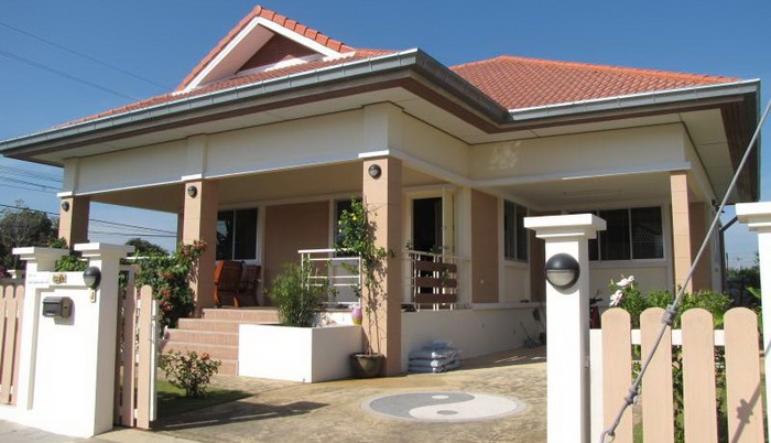 Hua Hin Villa บ้านชั้นเดียวดีไซน์เรียบง่าย ผนังก่ออิฐฉาบปูนตกแต่งด้วยโทนสีเบจทั้งหลัง พื้นที่นอกบ้านปูพื้นซีเมนต์เล่นลวดลายหยินหยางช่วยเพิ่มดีเทลน่าสนใจ หลังคามุงกระเบื้องลอนสีส้มอิฐทรงจั่วกึ่งปั้นหยารับกับโทนสีของบ้านได้อย่างลงตัว