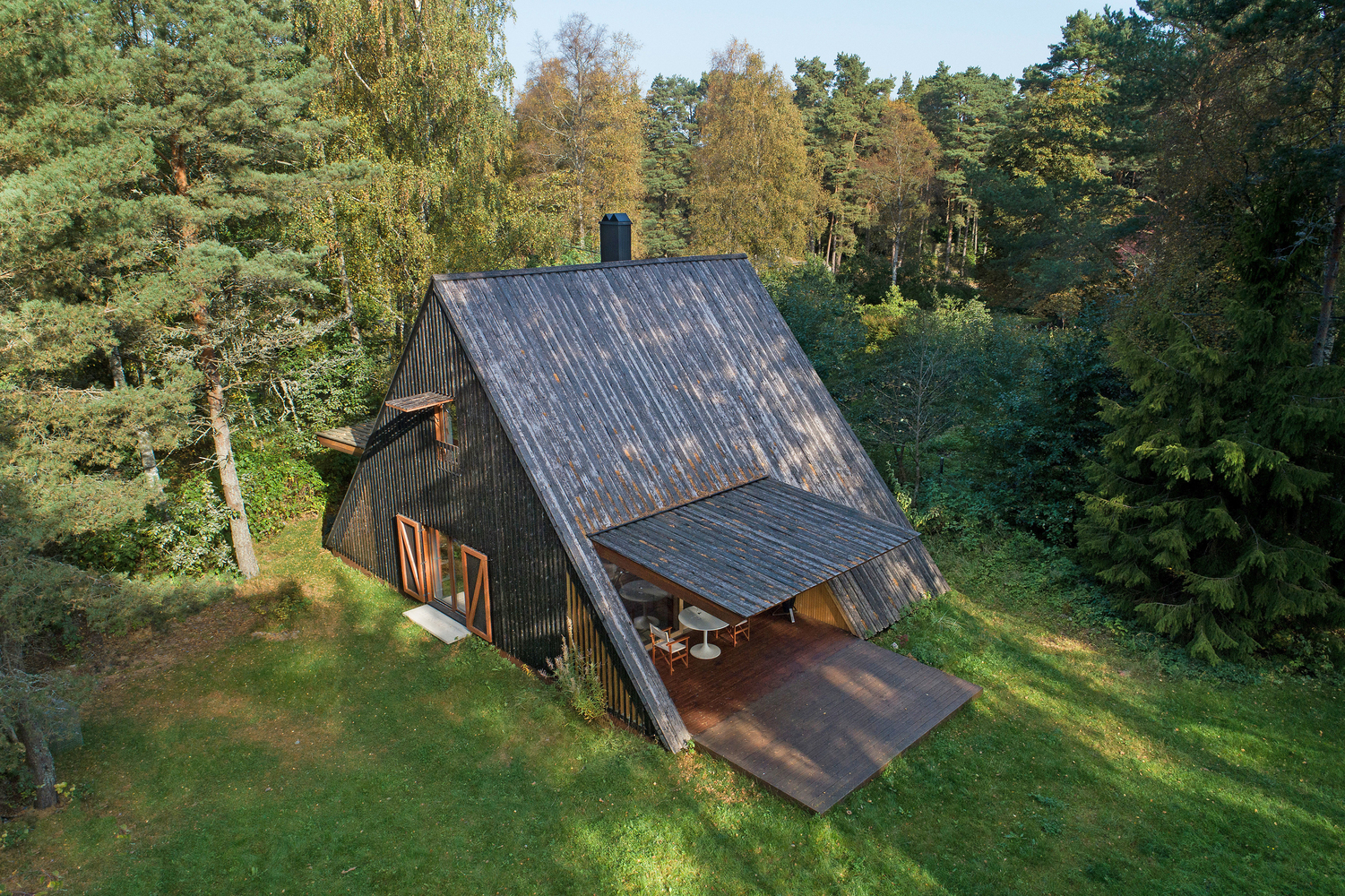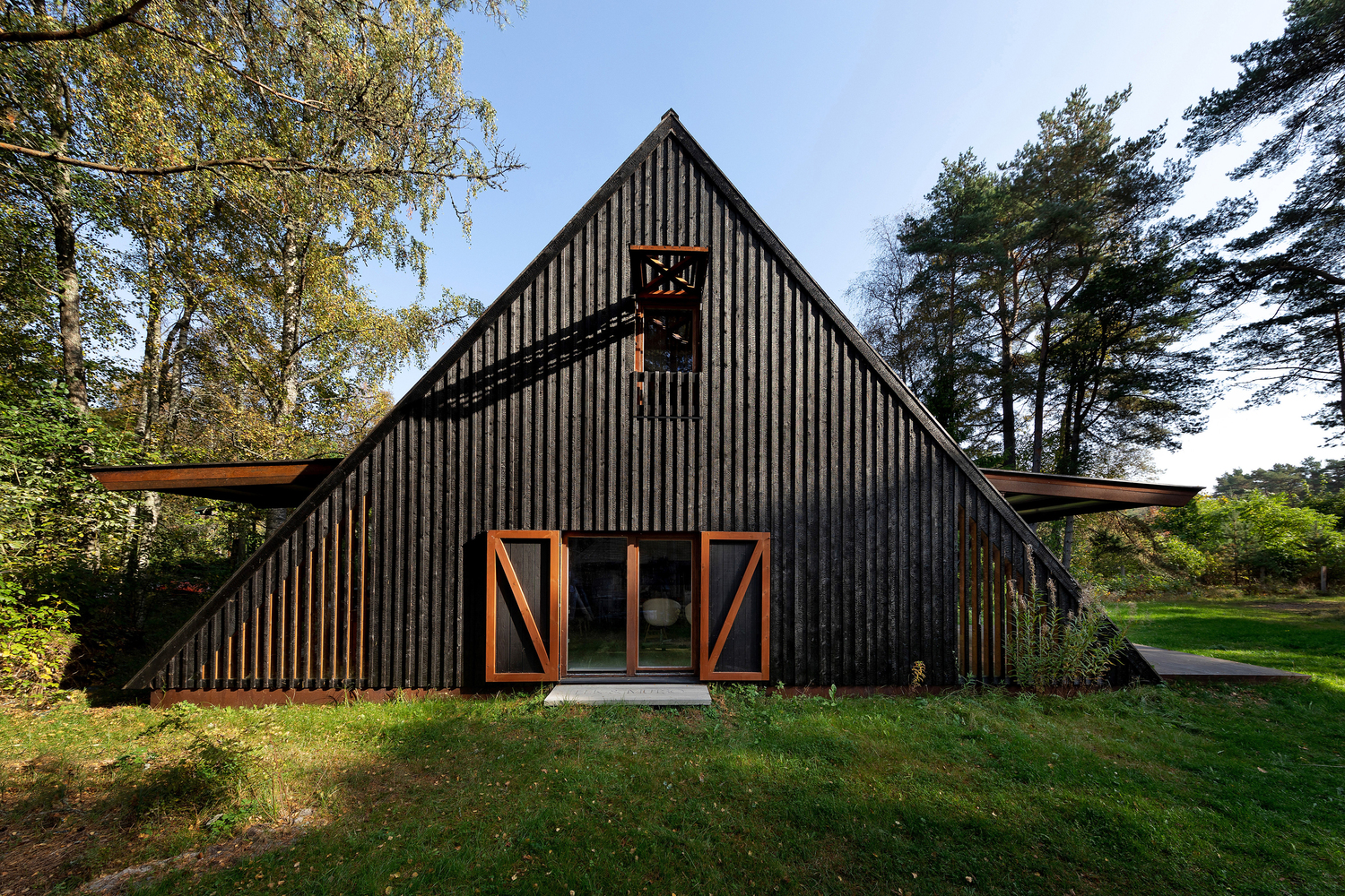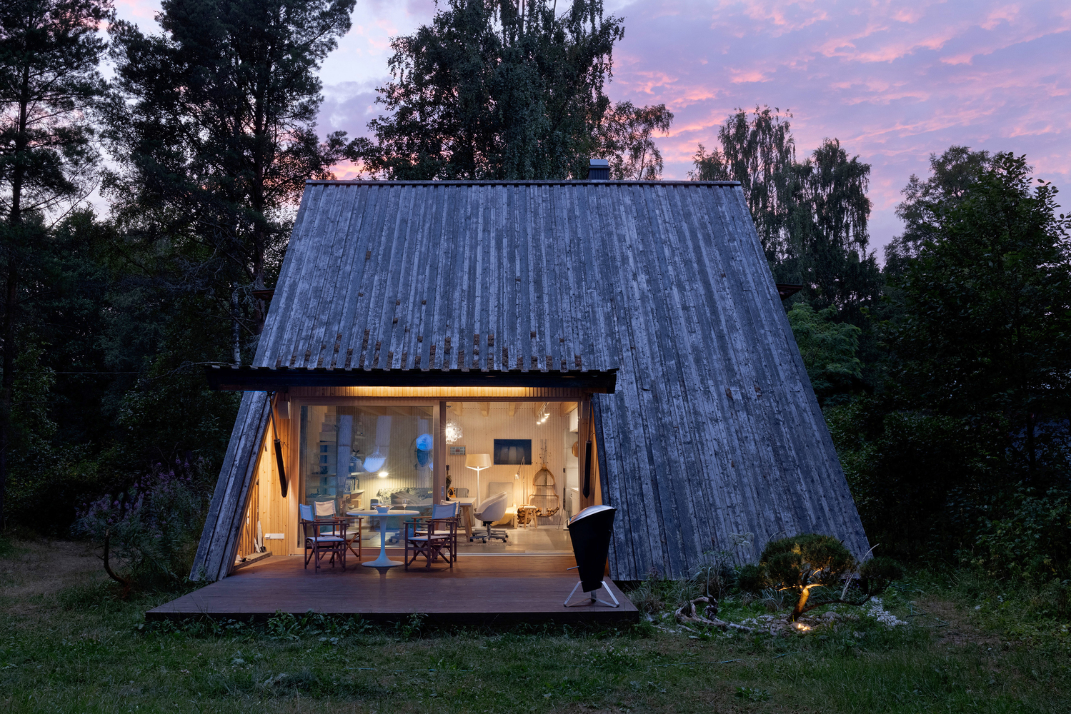 โดยตัวบ้านจะมีรูปทรงแบบสามเหลี่ยมแบบ A-frame ซึ่งเป็นการออกแบบเพื่อป้องกันหิมะทับถมในช่วงฤดูหนาวนั่นเอง ภายนอกจะเลือกทาด้วยสีดำ เพื่อช่วยดูดซับแสงอาทิตย์ ทำให้บ้านอุ่น