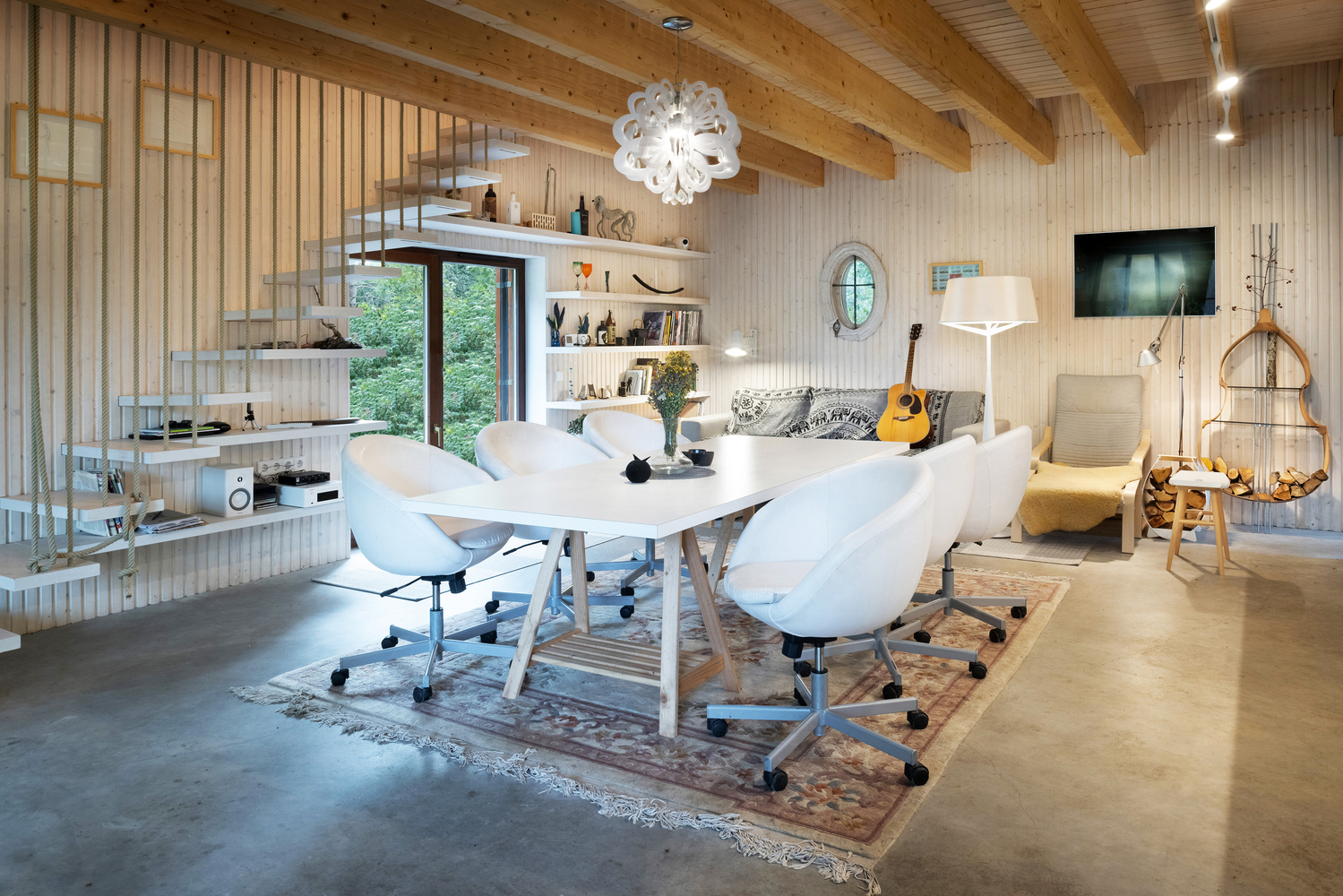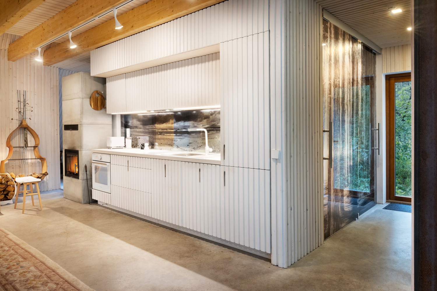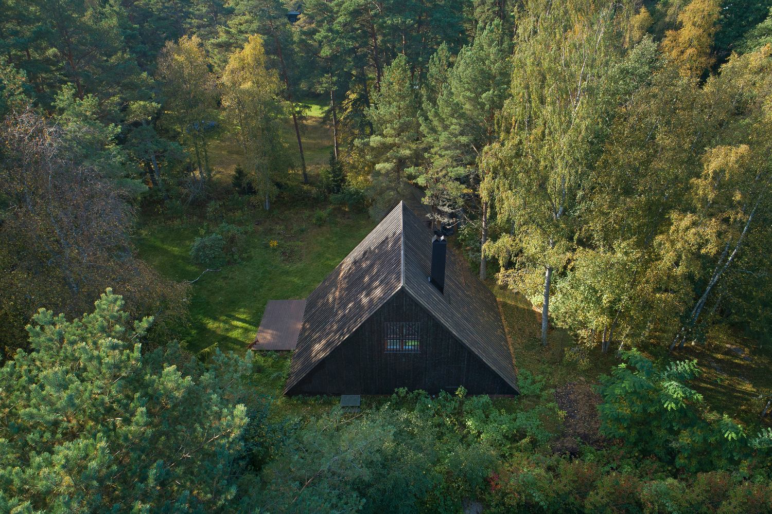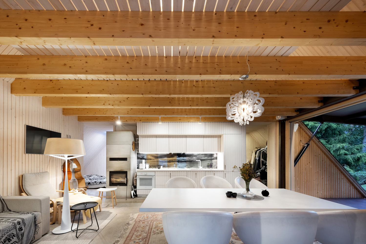 โดยตัวบ้านจะมีรูปทรงแบบสามเหลี่ยมแบบ A-frame ซึ่งเป็นการออกแบบเพื่อป้องกันหิมะทับถมในช่วงฤดูหนาวนั่นเอง ภายนอกจะเลือกทาด้วยสีดำ เพื่อช่วยดูดซับแสงอาทิตย์ ทำให้บ้านอุ่น
