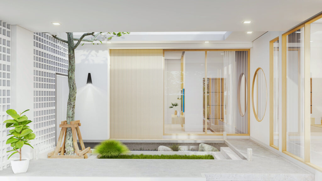 บริเวณหลังโรงจอดรถเป็นสวนในร่มที่มีต้นไม้โตขึ้นสูง ซึ่งผู้ออกแบบตั้งใจให้ต้นไม้เป็นส่วนหนึ่งในพื้นที่บ้าน จึงเจาะช่องหลังคาโรงจอดรถเพื่อให้ยอดต้นไม้โผล่เลยหลังคาขึ้นไป