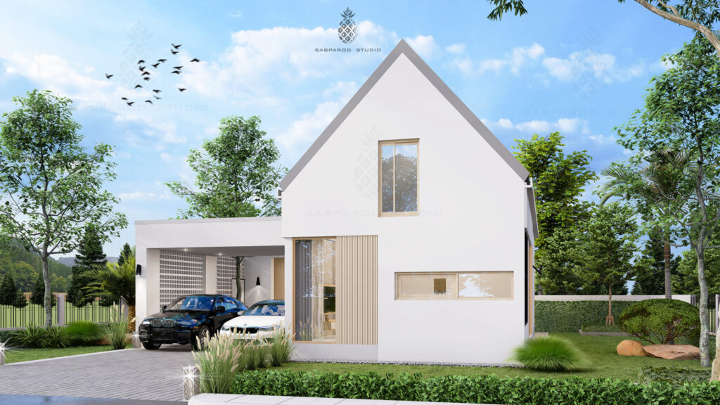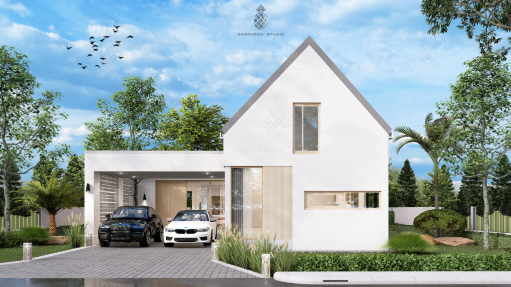หน้าบ้านมีโรงจอดรถทรงกล่องสี่เหลี่ยม ซึ่งเมื่อจัดไว้ข้าง ๆ กับตัวอาคารหลักที่มีลักษณะเป็นทรงจั่ว แอดมินเห็นแล้วรู้สึกว่ามันเป็นส่วนประกอบที่ผสานกันอย่างลงตัว ทำให้ตัวบ้านมีเส้นสายที่มีมิติและมีเอกลักษณ์มากขึ้น