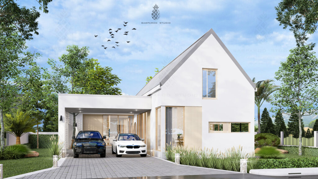 บ้านชั้นเดียว รูปทรงตัวแอล หน้าแคบหลังลึก หลังคาทรงจั่วสูงที่ให้กลิ่นอายเหมือนโรงนาประเทศแถบยุโรป ผนังภายนอกเลือกใช้โทนสีขาวทั้งหลัง โดยมีรายละเอียดของงานไม้อยู่เล็กน้อย สังเกตได้จากวงกบของประตูหน้าต่าง ช่วยเพิ่มความอบอุ่นให้กับภาพรวมของตัวบ้าน