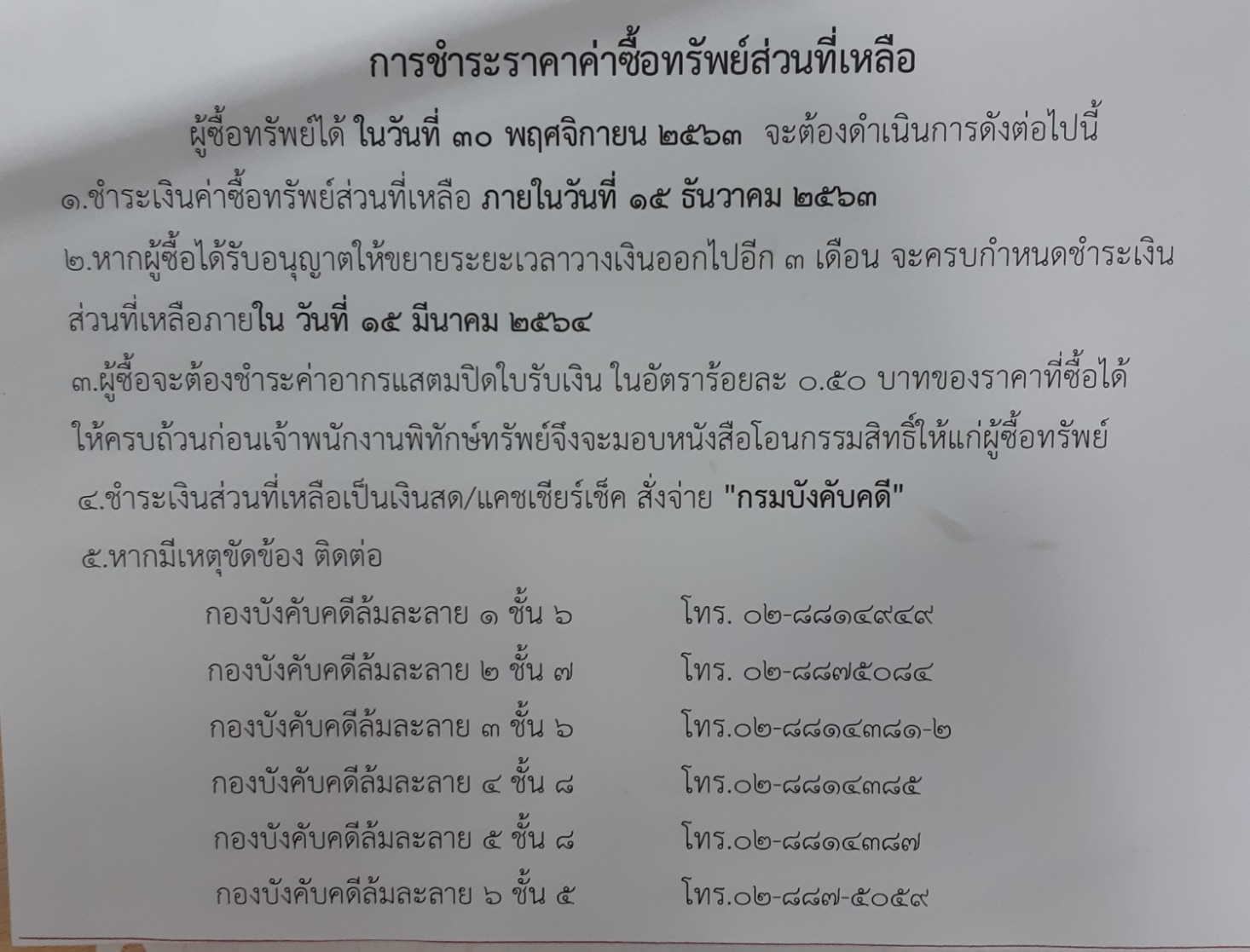 - นำต้นฉบับใบรับเงิน และ สำเนาสัญญาซื้อขายไปติดต่อได้ที่อาคารกรมบังคับคดี (ตามกองบังคับฯ นั้นอยู่)