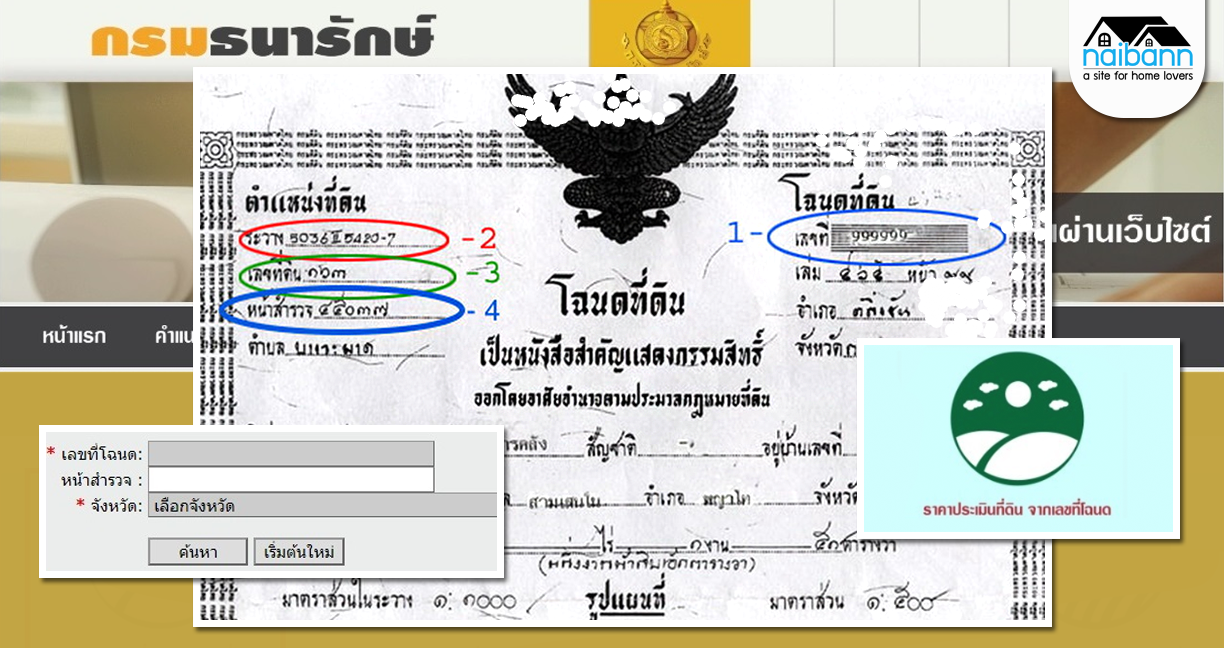 4. หยิบโฉนดที่ดินขึ้นมาแล้วสังเกตดูในตำแหน่งเลขที่ดิน (ตำแหน่ง 1) และ เลขหน้าสำรวจ (ตำแหน่งที่ 4)