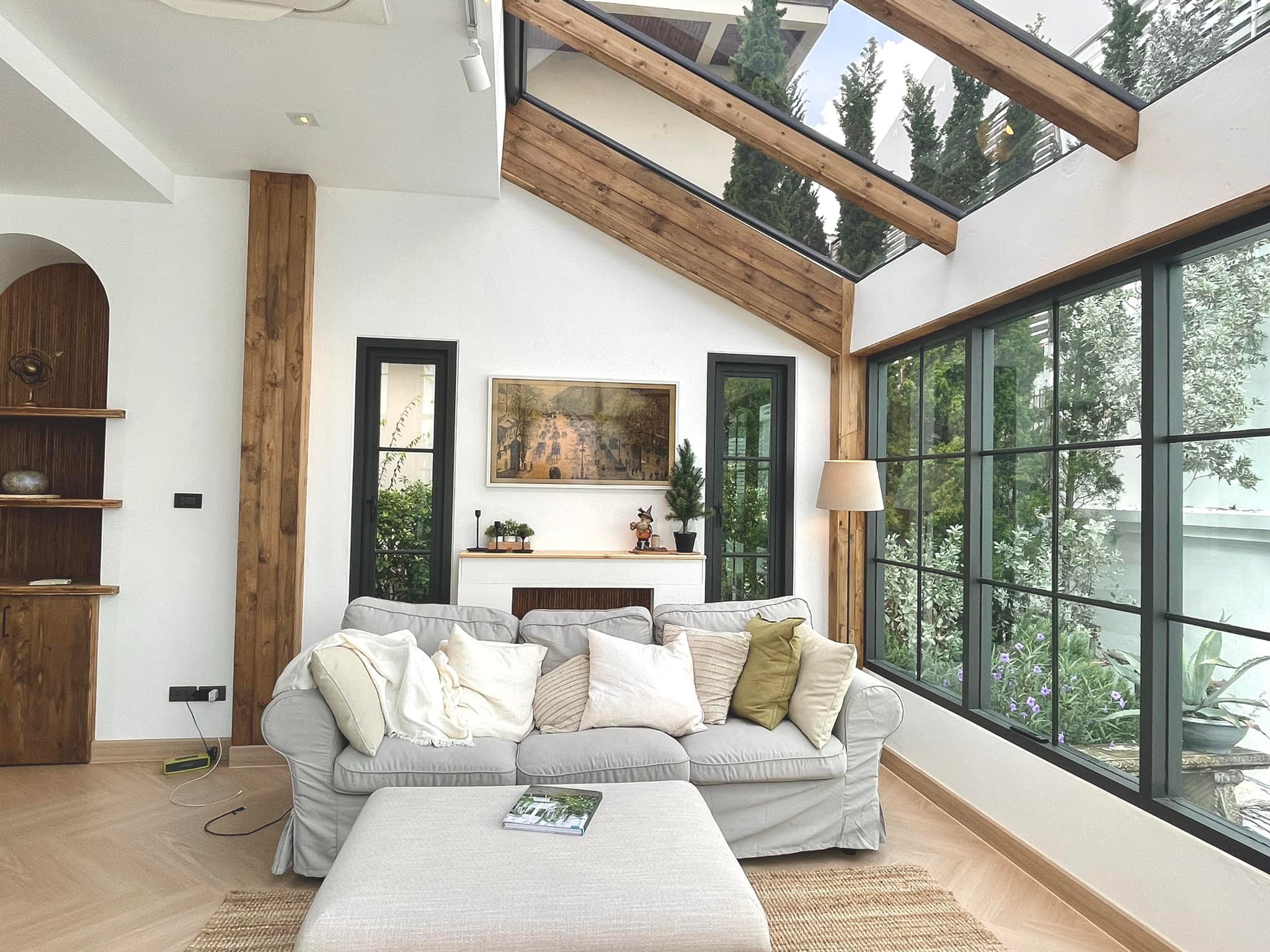 สำหรับห้องกระจกที่ต่อเติมเข้ามานั้น ภายในจะเป็นพื้นที่พักผ่อนที่ให้กลิ่นอายการตกแต่งแบบยุโรปอย่างเด่นชัด ผ่านการออกแบบด้วยเสาและคานไม้ ผนังสีขาว รวมไปถึงเฟอร์นิเจอร์และวัสดุอื่น ๆ ที่มีความโมเดิร์นหน่อย ๆ