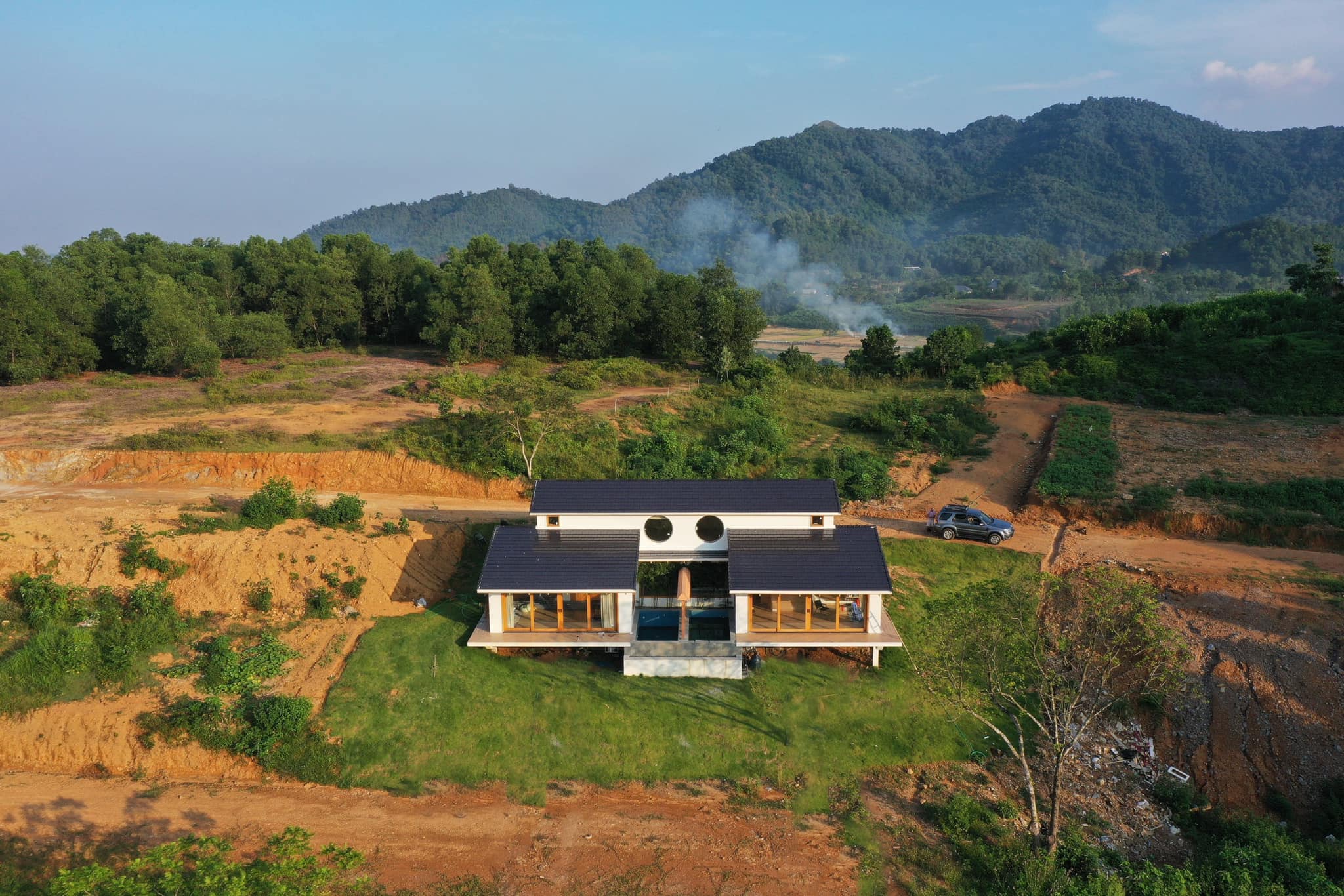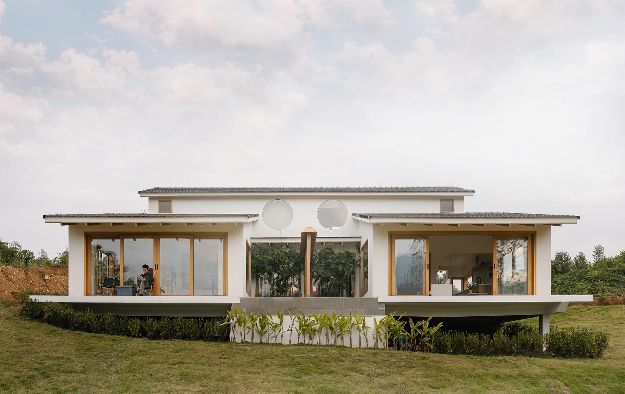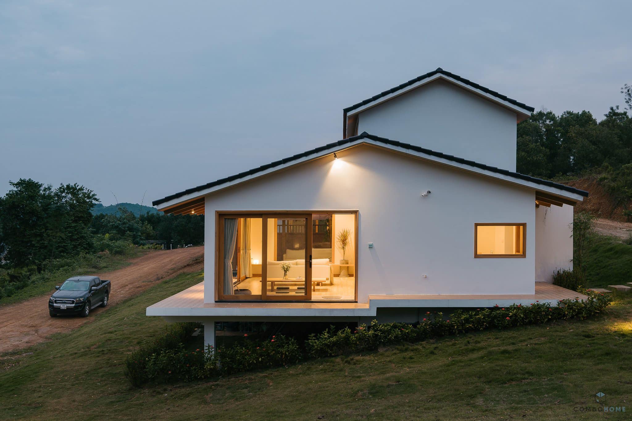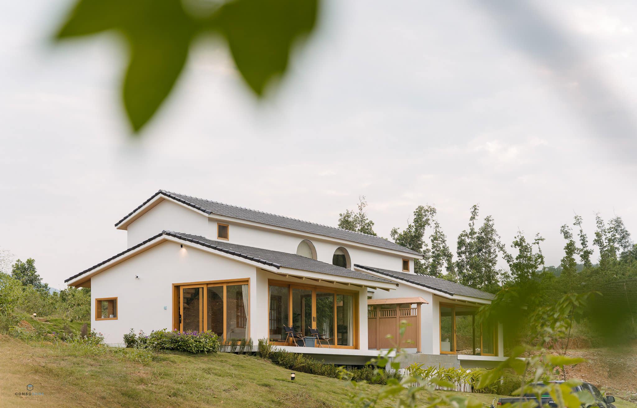 เมื่อมองบ้านหลังนี้จากไกล ๆ เราก็จะเห็นว่าบ้านถูกห้อมล้อมด้วยภูเขาและต้นไม้ รอบบ้านจึงให้บรรยากาศที่สงบและเป็นส่วนตัว