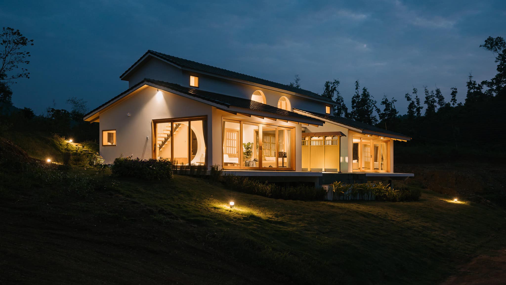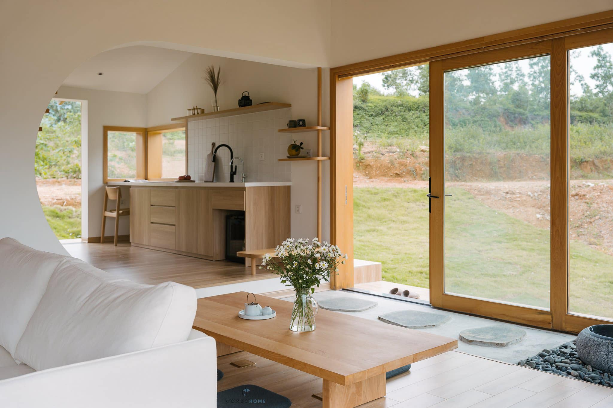 ตัวบ้านตั้งอยู่บนที่ลาดเชิงเขา จึงทำให้มีส่วนหนึ่งของบ้านที่ยกขึ้นสูงจากพื้น ล้อมรอบด้วยเฉลียงกว้าง มีห้องนั่งเล่นเป็นพื้นที่หลักเพื่อให้สมาชิกทุกคนมารวมตัวกันเพื่อดื่มชา ชมวิวภูเขา เห็นทิวทัศน์ของธรรมชาติด้านนอก