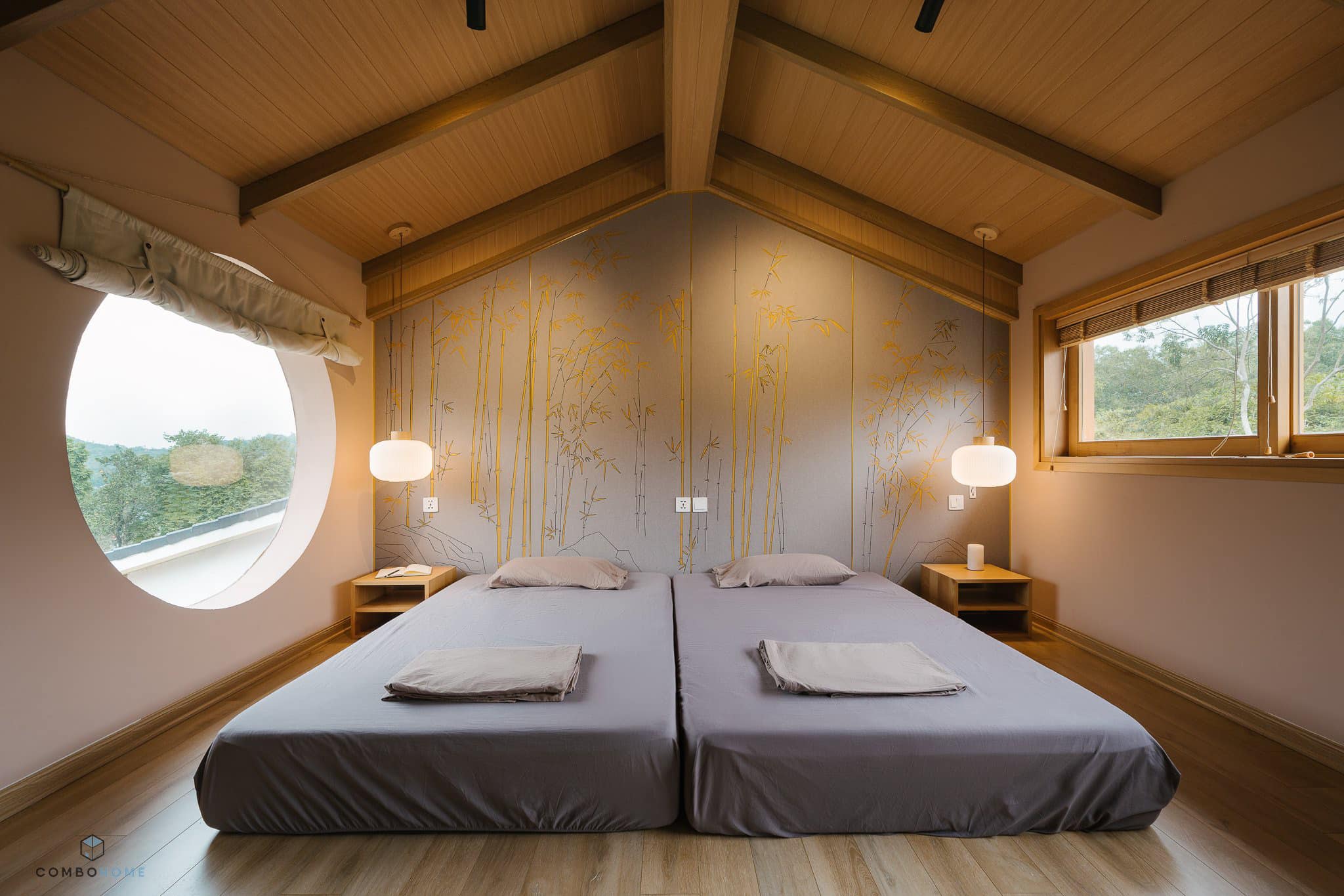 สำหรับห้องนอนจะตั้งอยู่ชั้นบน ซึ่งเป็นห้องใต้หลังคา โดยภายในจะมีจุดเด่นตรงที่เพดานยกสูง รวมไปถึงหน้าต่างแบบญี่ปุ่นทั้งแบบทรงกลม และทรงสี่เหลี่ยมผืนผ้า