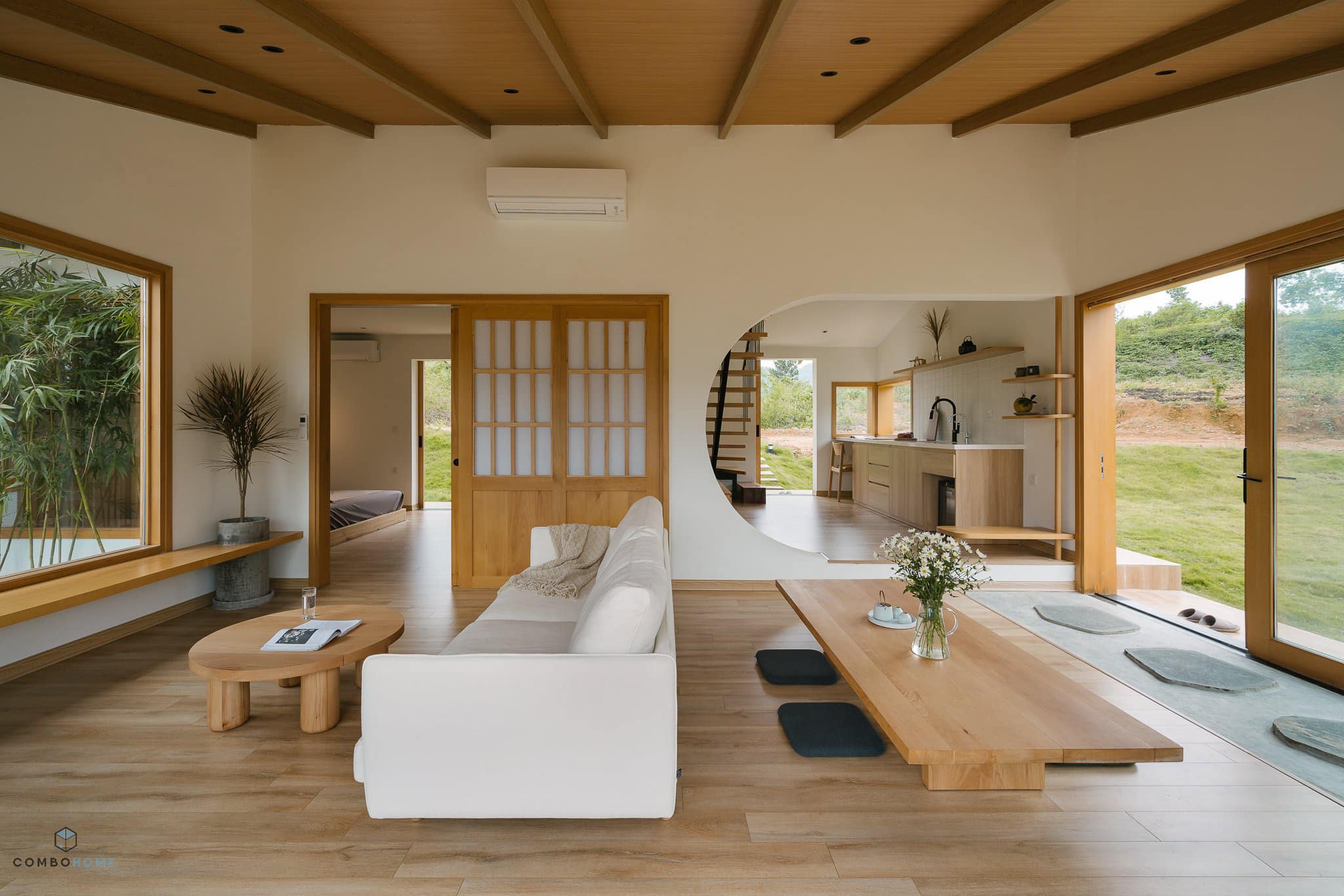 งานออกแบบหลังคาจะเป็นหลังคาทรงหน้าจั่วที่เหมาะกับภูมิอากาศแบบอาเซียนที่แดดจัดและมีฝนชุก และแน่นอนว่าด้านการตกแต่ง ตัวบ้านก็มีโทนสีที่อ่อนโยนตามสไตล์มินิมอลนั่นเอง