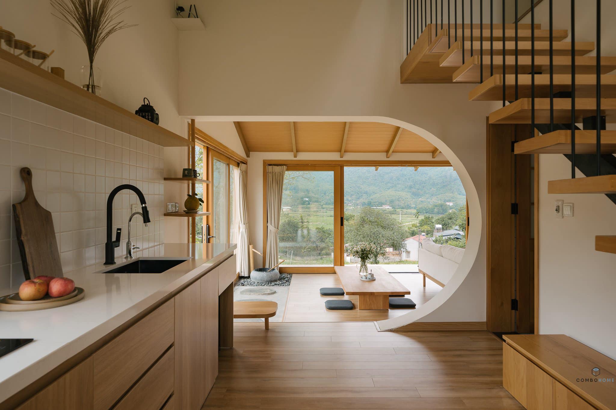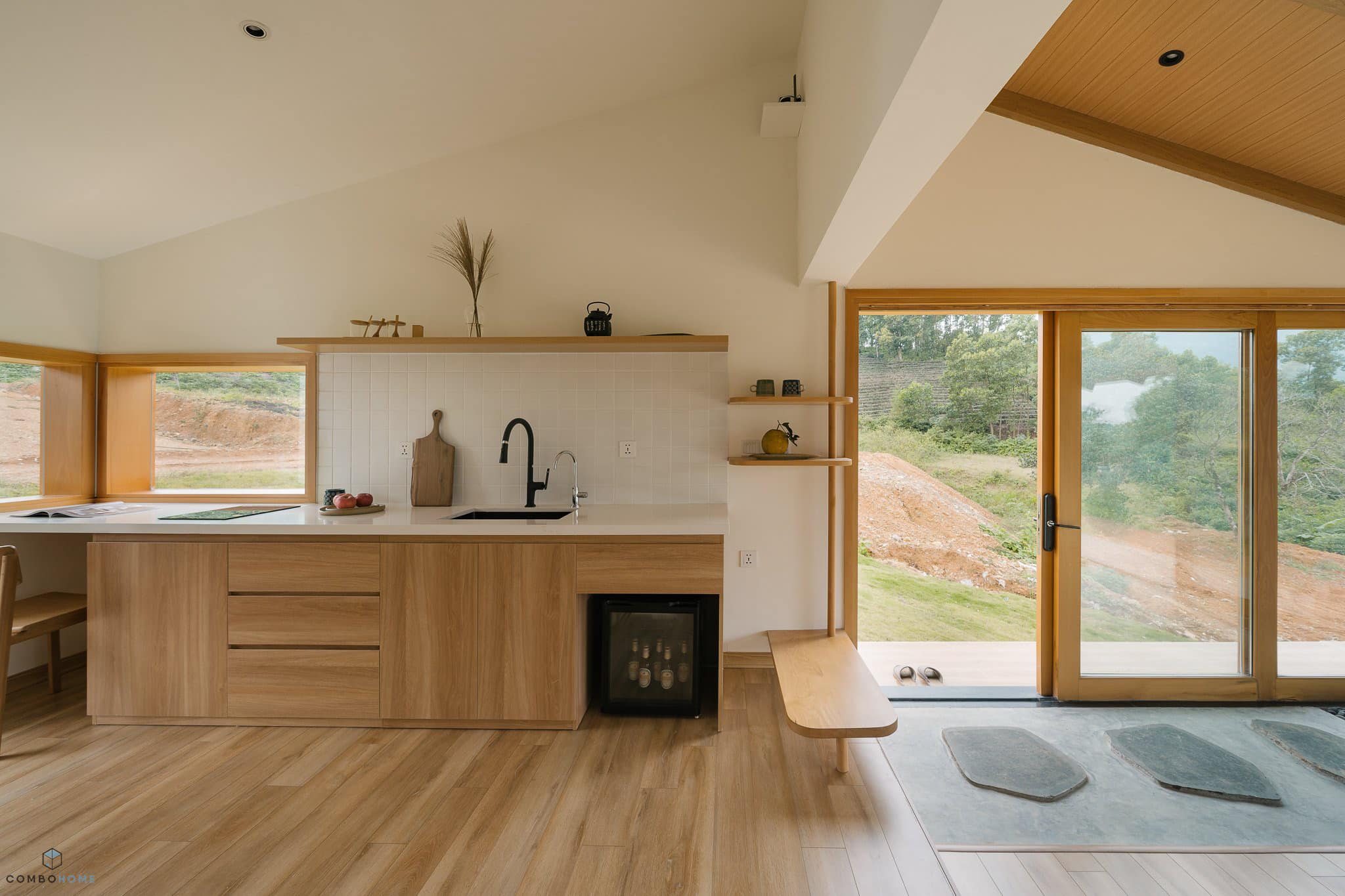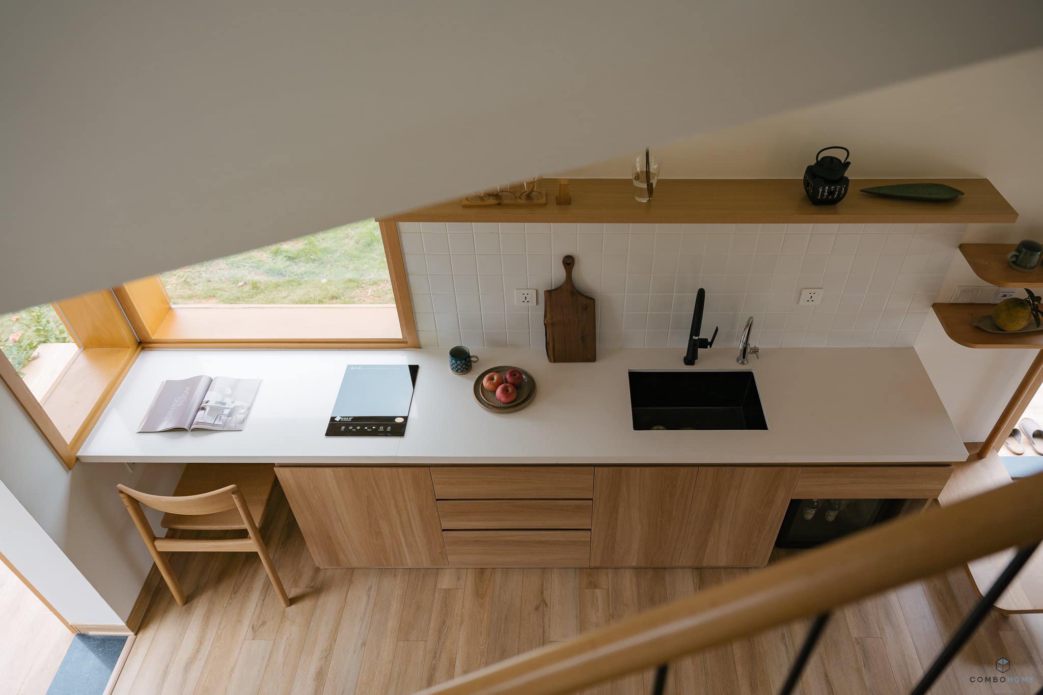 ไม่ไกลจากห้องนั่งเล่น คือ ห้องครัวแบบเรียบง่าย ซึ่งจะมีเคาน์เตอร์ครัวแบบเรียบ ๆ ที่สามารถประกอบอาหารมื้อง่าย ๆ ได้อย่างสะดวก