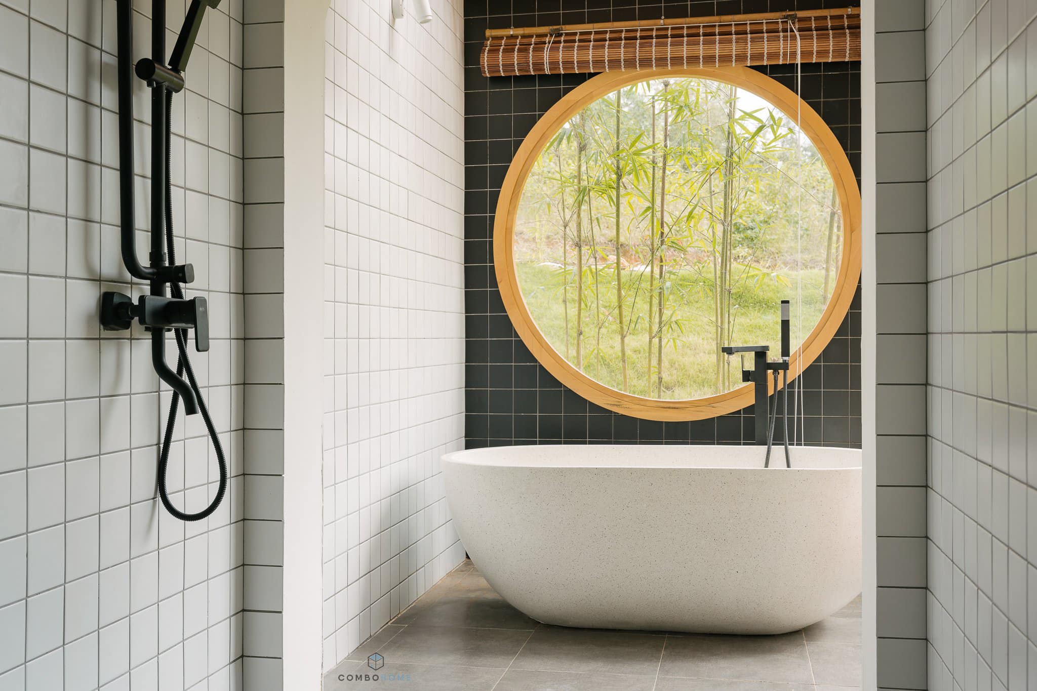 ปิดท้ายกันด้วยห้องน้ำ ที่ยังคงมีองค์ประกอบแบบห้องน้ำทั่วไปที่จะเน้นการตกแต่งที่ให้ความสว่าง แต่ส่วนที่ต่างออกไป ก็คงจะเป็นหน้าต่างทรงกลมขนาดใหญ่ ที่ให้วิวสวย ๆ ในขณะที่เรานอนแช่น้ำแบบสบายตัวไปด้วย