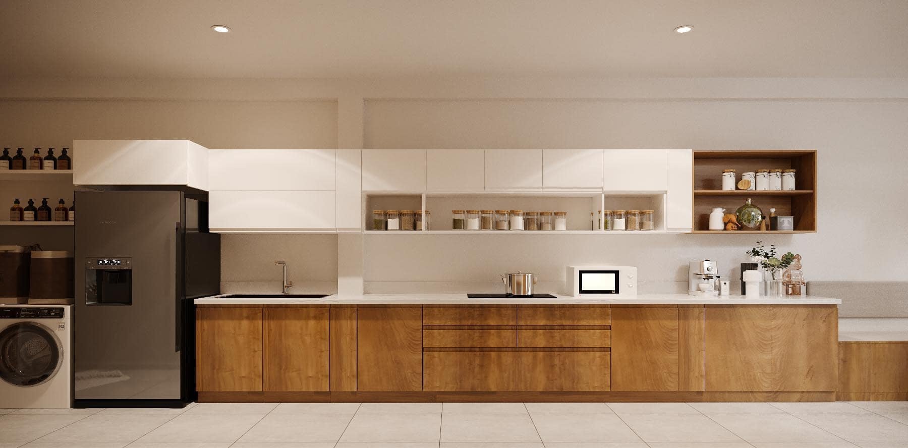 ในส่วนของห้องครัวถูกออกแบบและตกแต่งมาในสไตล์โมเดิร์น แต่ยังคงมีดีเทลที่เรียบง่ายแบบโมเดิร์น เป็นอีกหนึ่งองค์ประกอบของบ้านที่ตกแต่งออกมาได้ดีเลย