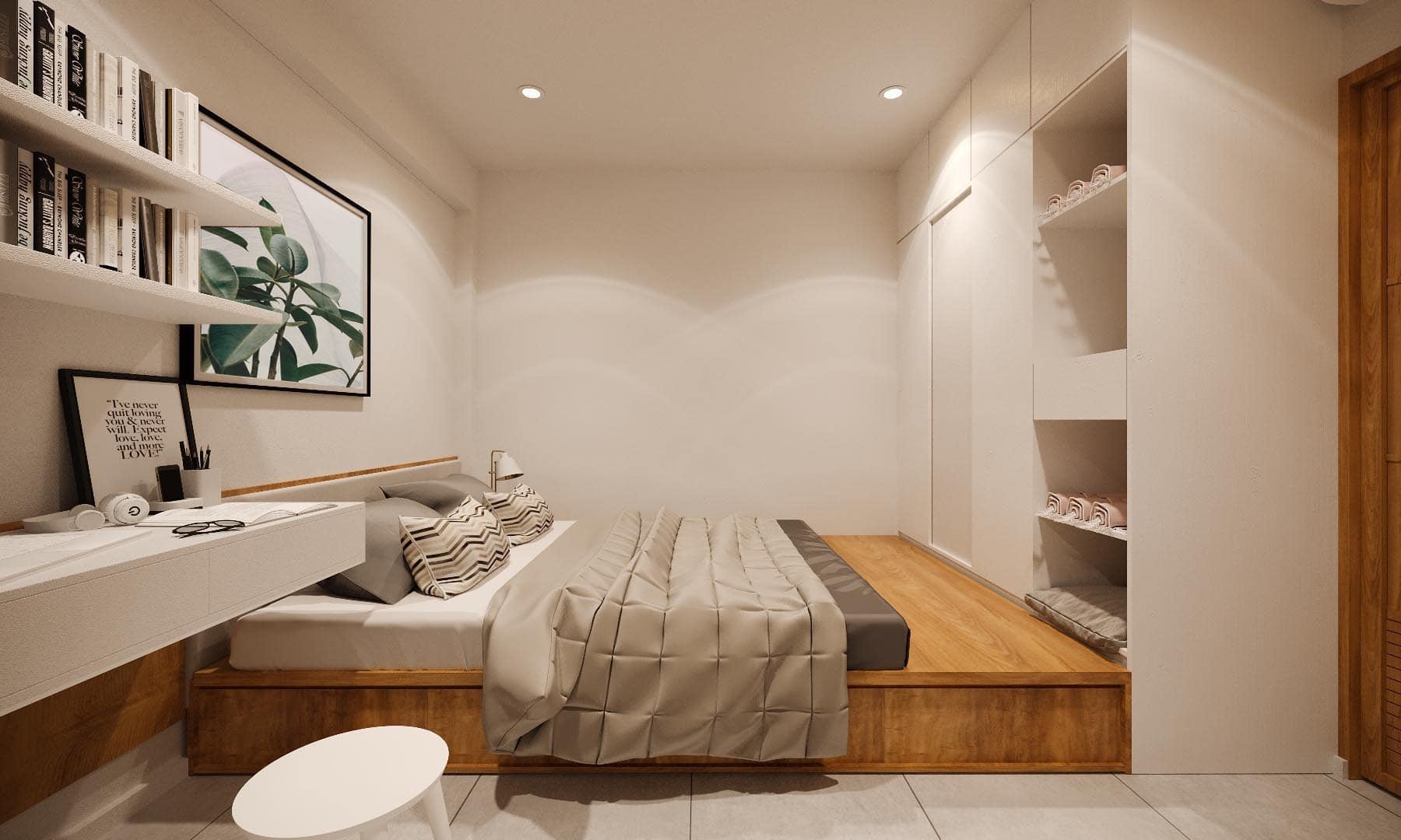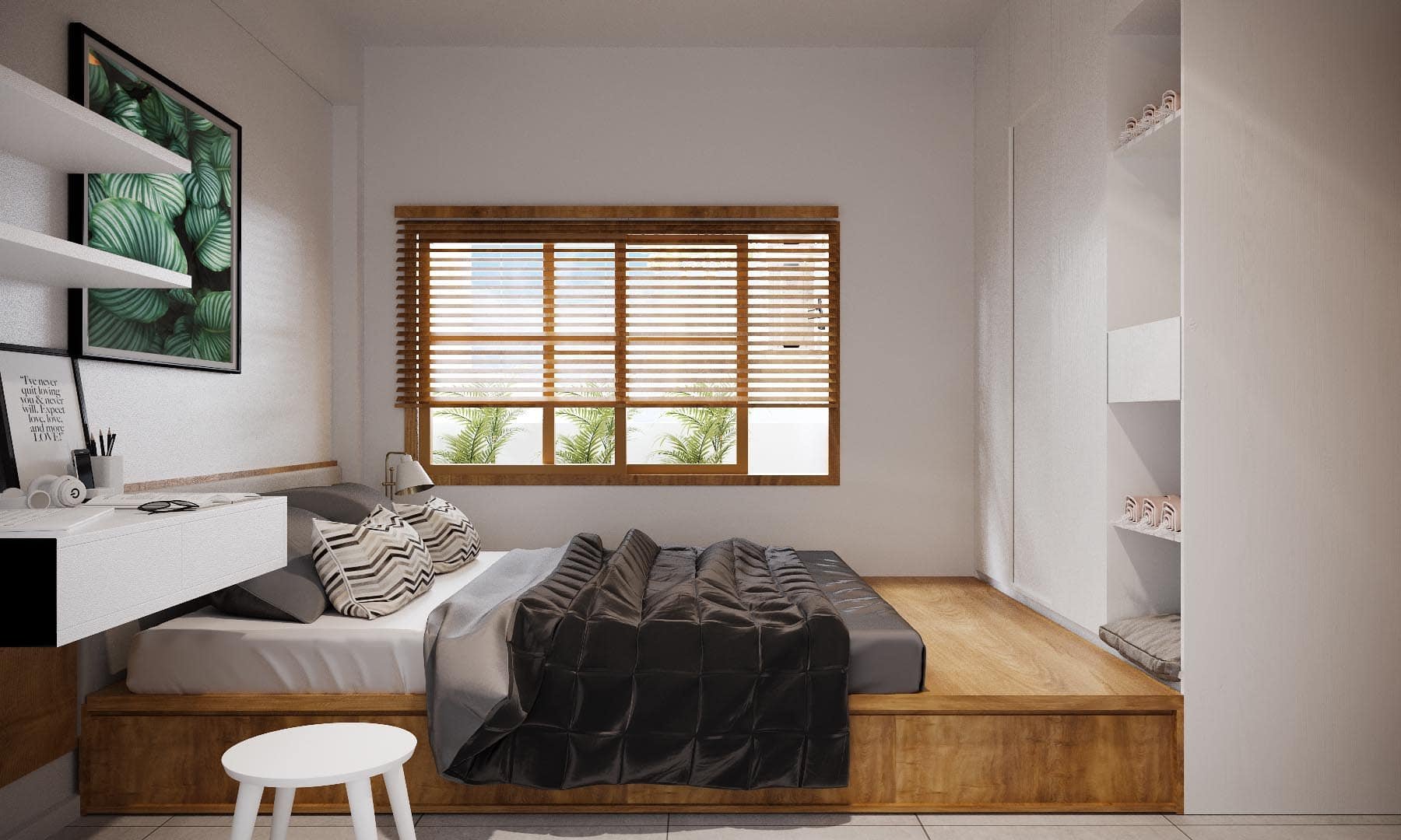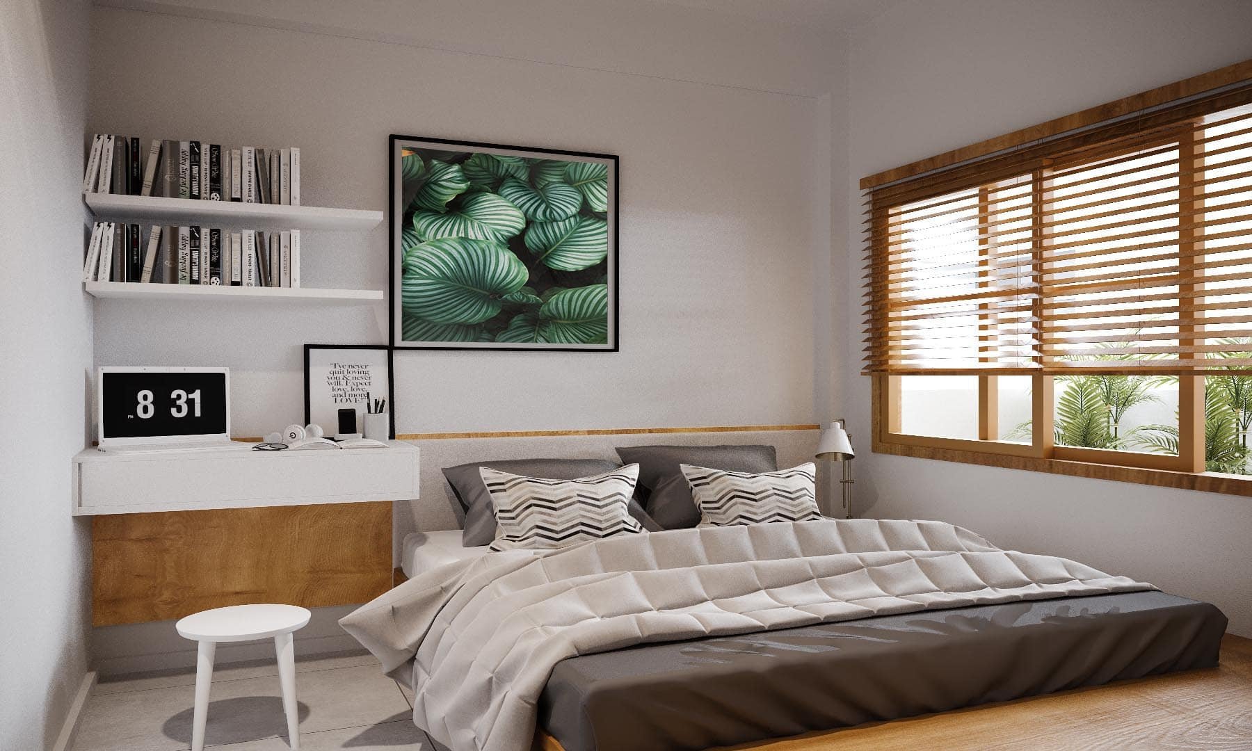 ภายในส่วนของห้องนอน เป็นอีกส่วนหนึ่งที่ยังคงตกแต่งในโทนสีและบรรยากาศที่อบอุ่น โดยตัวห้องยังมีหน้าต่างบานใหญ่ที่ช่วยรับแสงและถ่ายเทอากาศได้ดีอีกด้วย