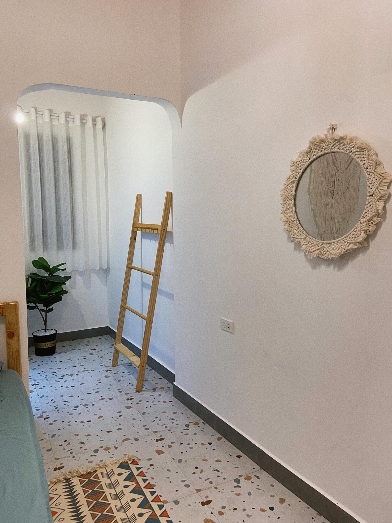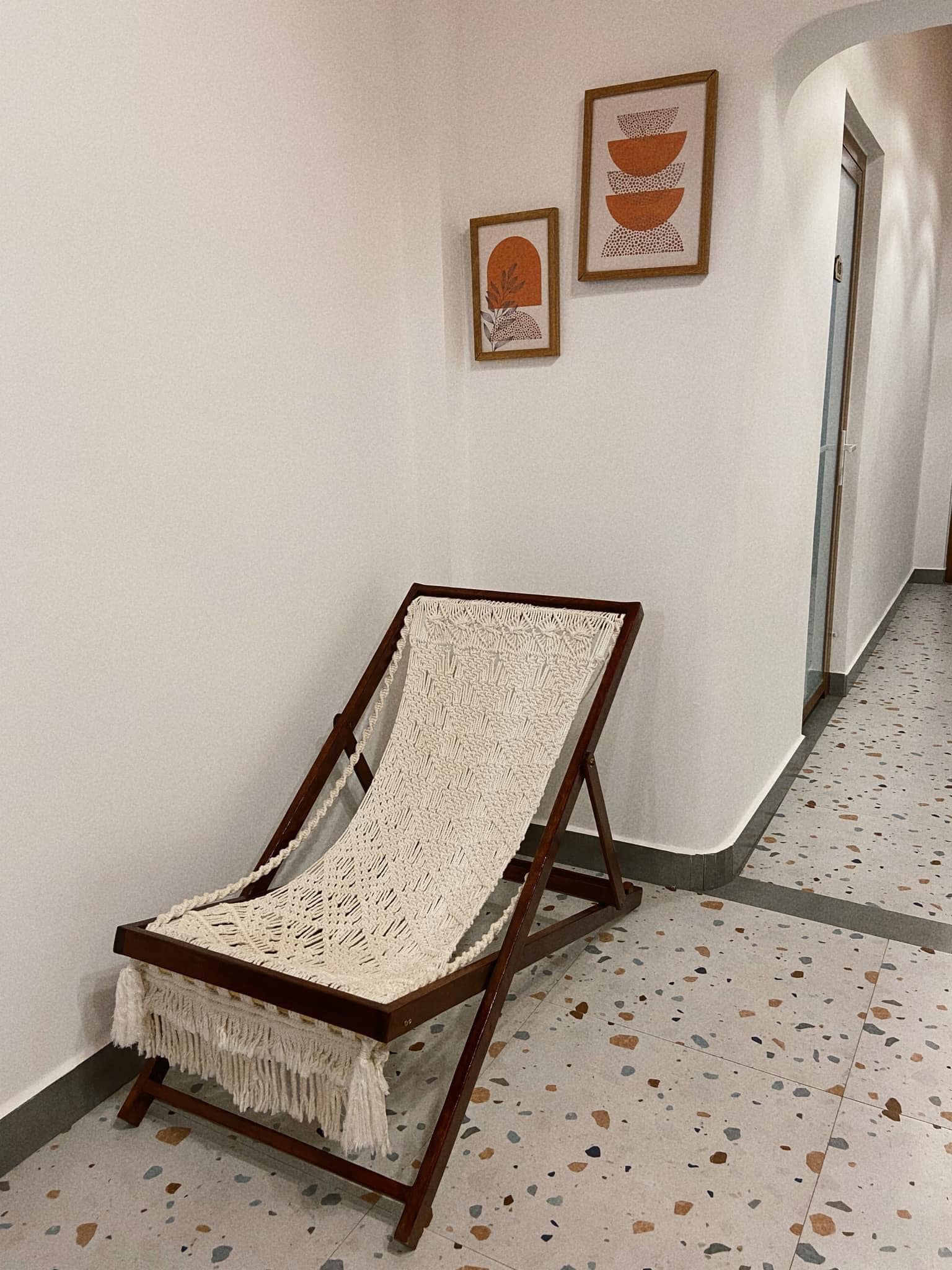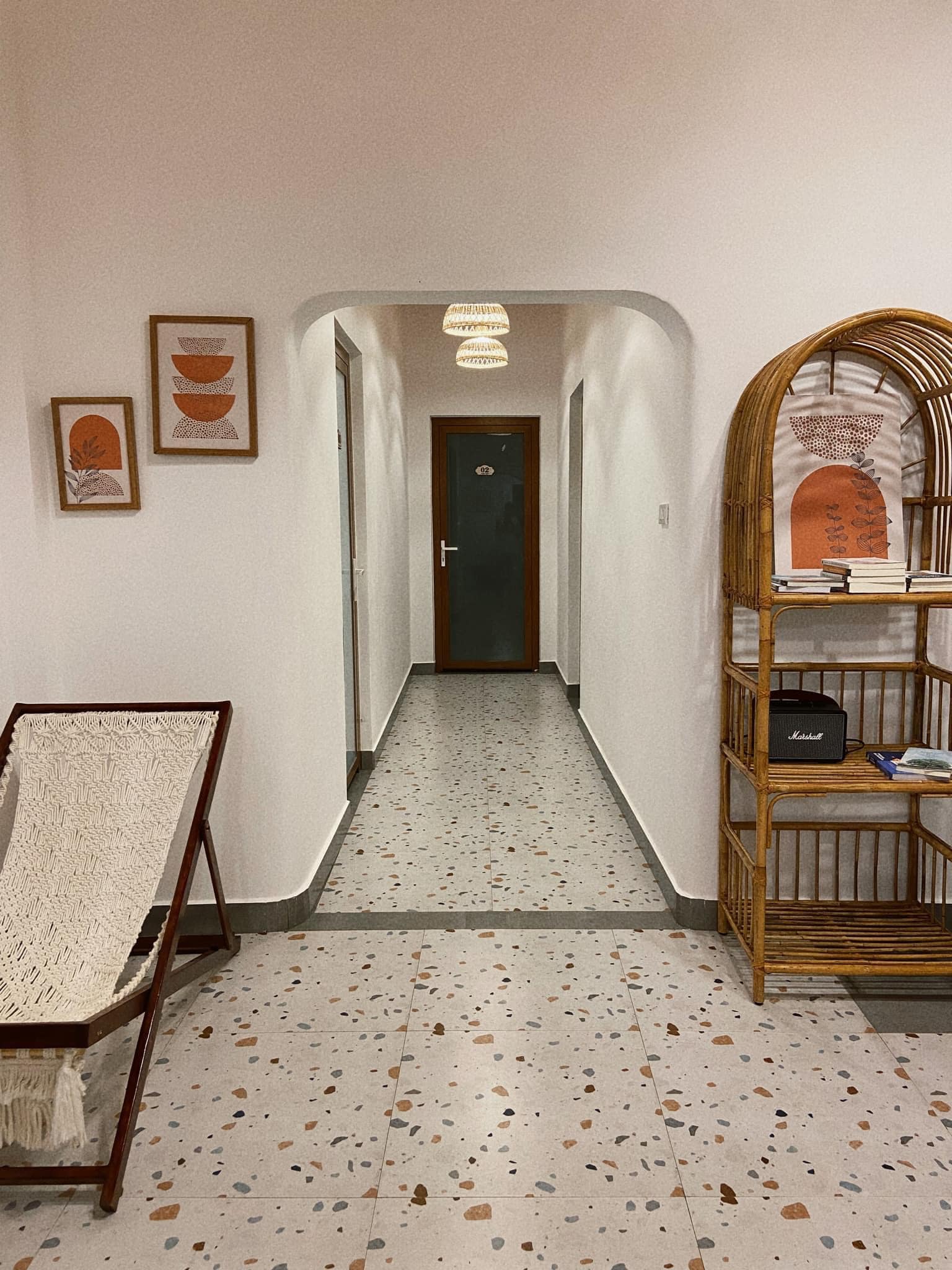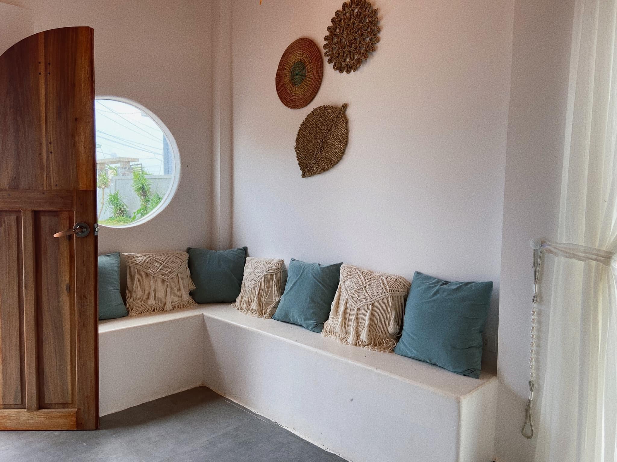 เมื่อเราเข้ามาภายในบ้าน ก็จะพบกับโถงเล็ก ๆ ที่ถูกจัดเป็นม้านั่งสำหรับนั่งเล่น หรือเป็นมุมรับแขกจุดแรกของบ้าน