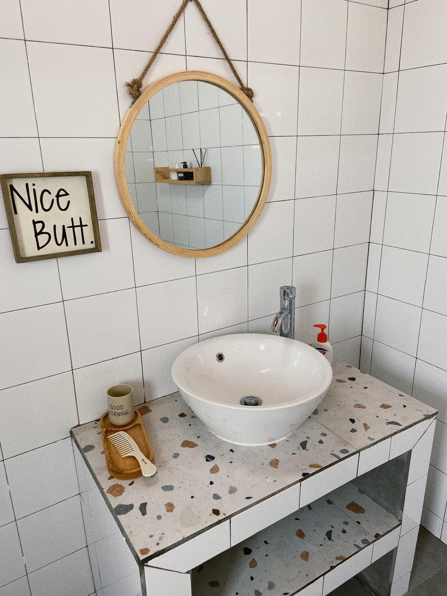มุมของอ่างล้างมือ เป็นอีกมุมที่มีรายละเอียดการตกแต่งที่น่ารัก ไล่ไปตั้งแต่กระจกทรงกลม ผ้ากันเปื้อน รวมไปถึงต้นไม้เล็ก ๆ ที่เพิ่มสีเขียวให้ห้อง