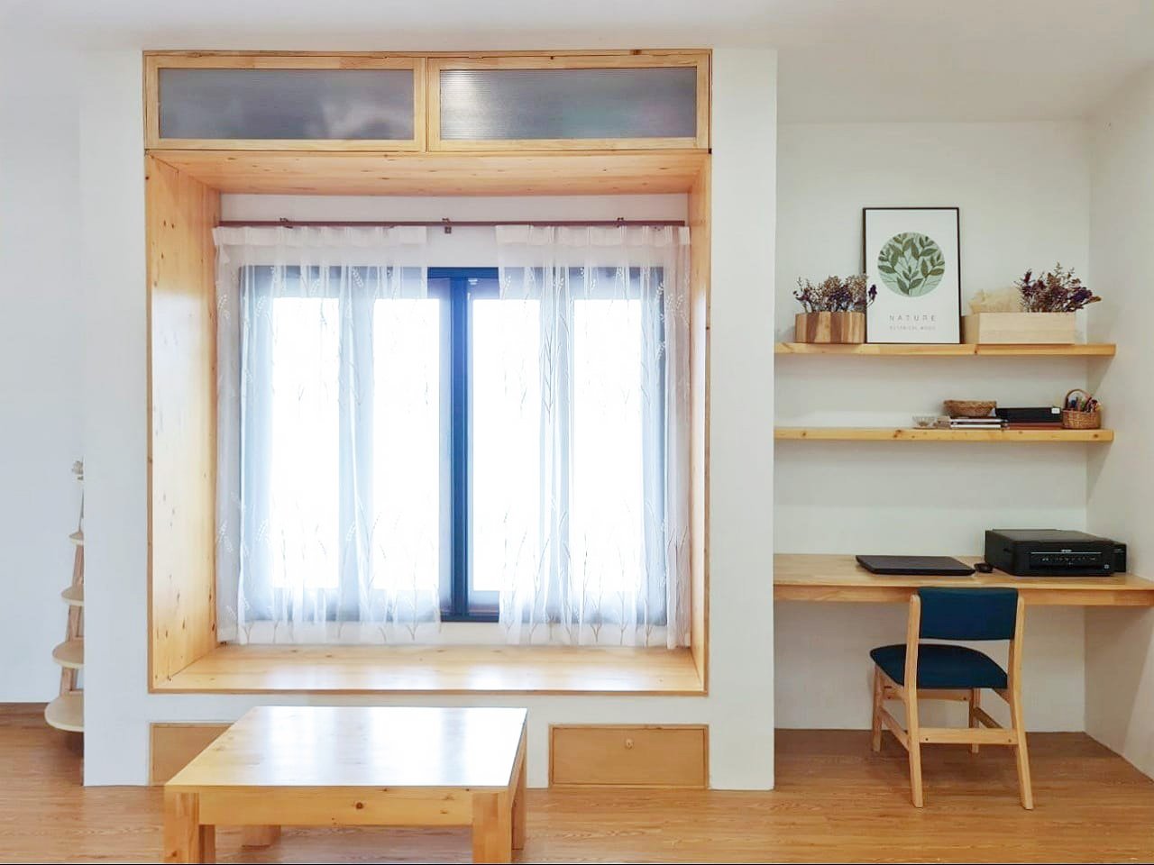 แต่ละมุมภายในบ้าน ถูกออกแบบให้สามารถใช้ประโยชน์ได้เต็มที่ อย่างบริเวณหน้าต่างก็จะมีบาร์เล็ก ๆ ให้ใช้เป็นโต๊ะ หรือที่วางของ ในขณะที่มุมห้องก็ติดแผ่นไม้ใช้งานเป็นโต๊ะทำงานไว้ด้วย