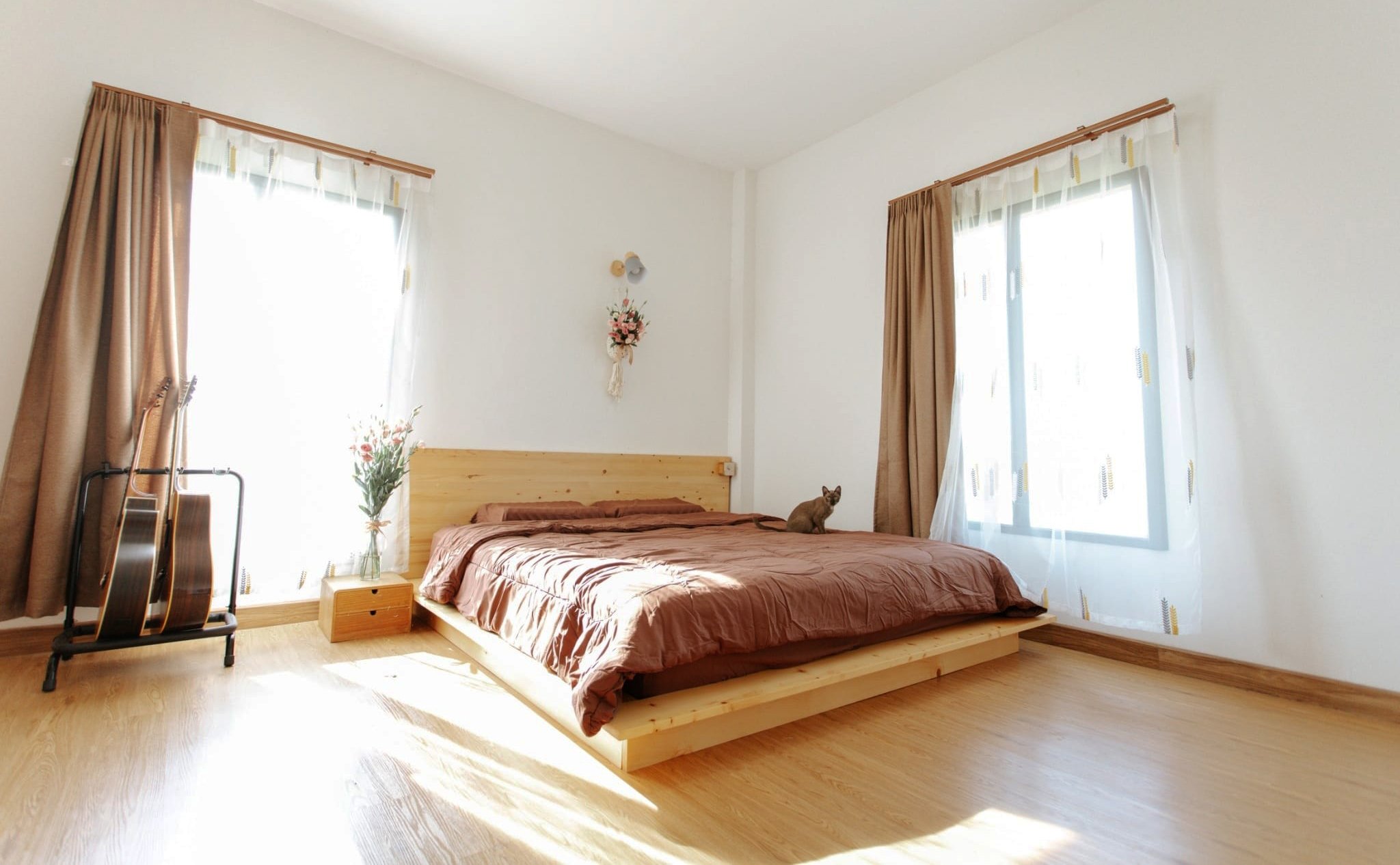 ทางด้านห้องนอน ถูกตกแต่งในบรรยากาศที่เรียบง่าย โปร่งสบาย สามารถรับแสงจากหน้าต่างได้หลายมุม เตียงจะเป็นแบบบิวท์อิน จึงแข็งแรงและนอนได้สบาย