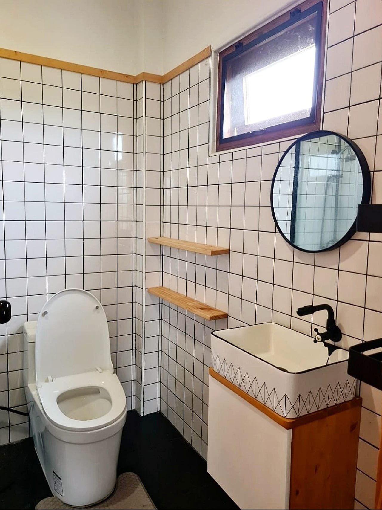 ห้องน้ำเป็นอีกห้องที่รับแสงได้ดี การเลือกใช้แผ่นกระเบื้องสีขาว นอกจากจะสวยแล้ว ยังลดบรรยากาศที่ดูอึดอัดภายในห้องน้ำได้อีกด้วย
